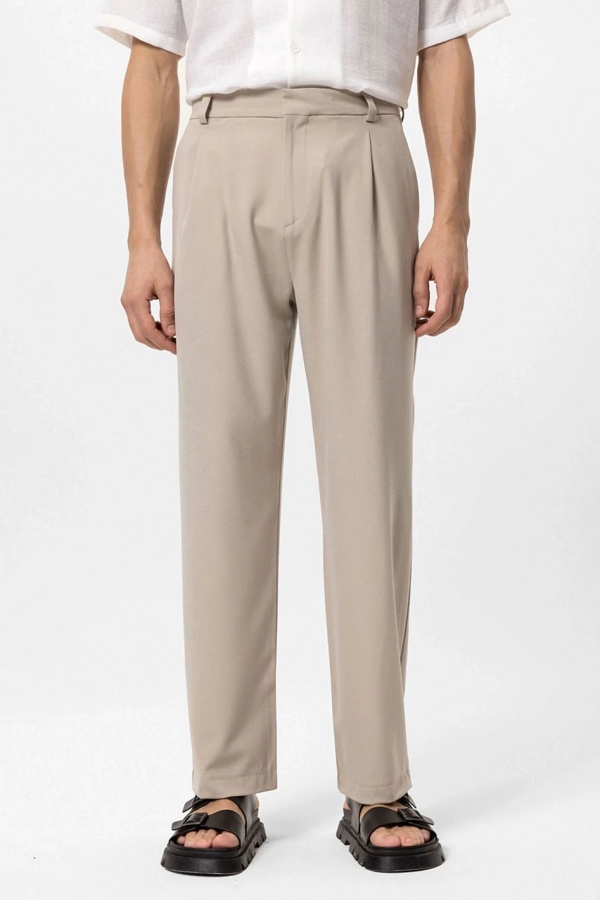 Erkek Bagy Kalıp Pileli Kumaş Pantolon -Krem