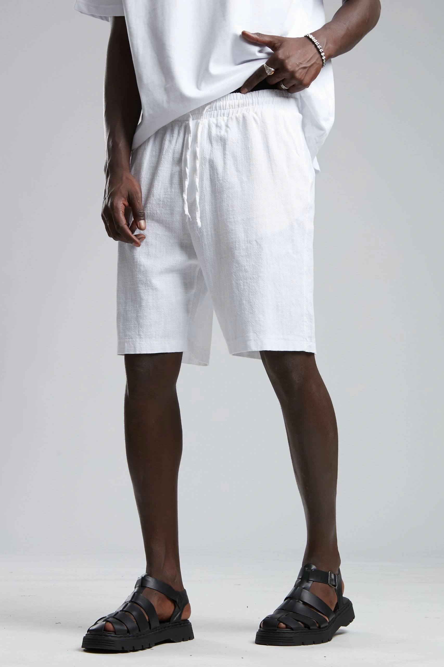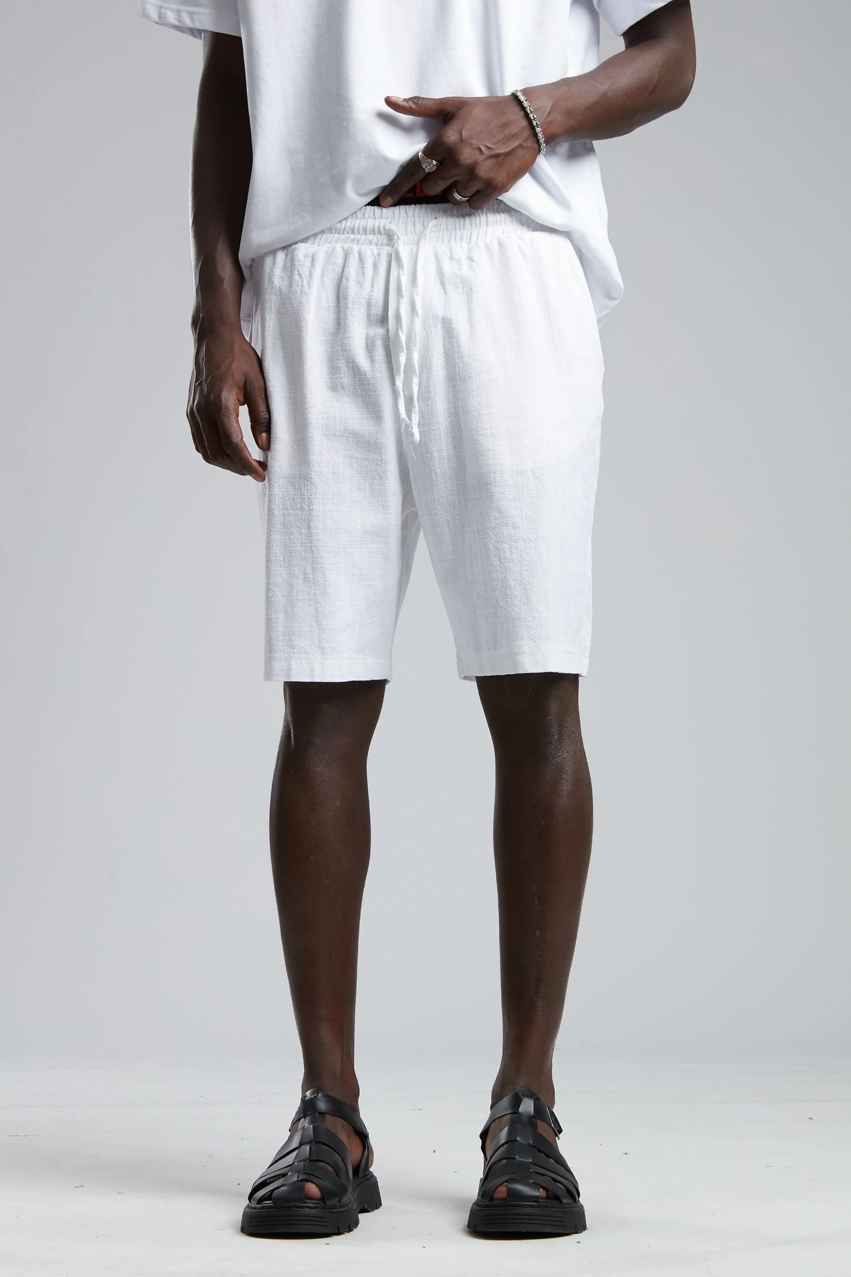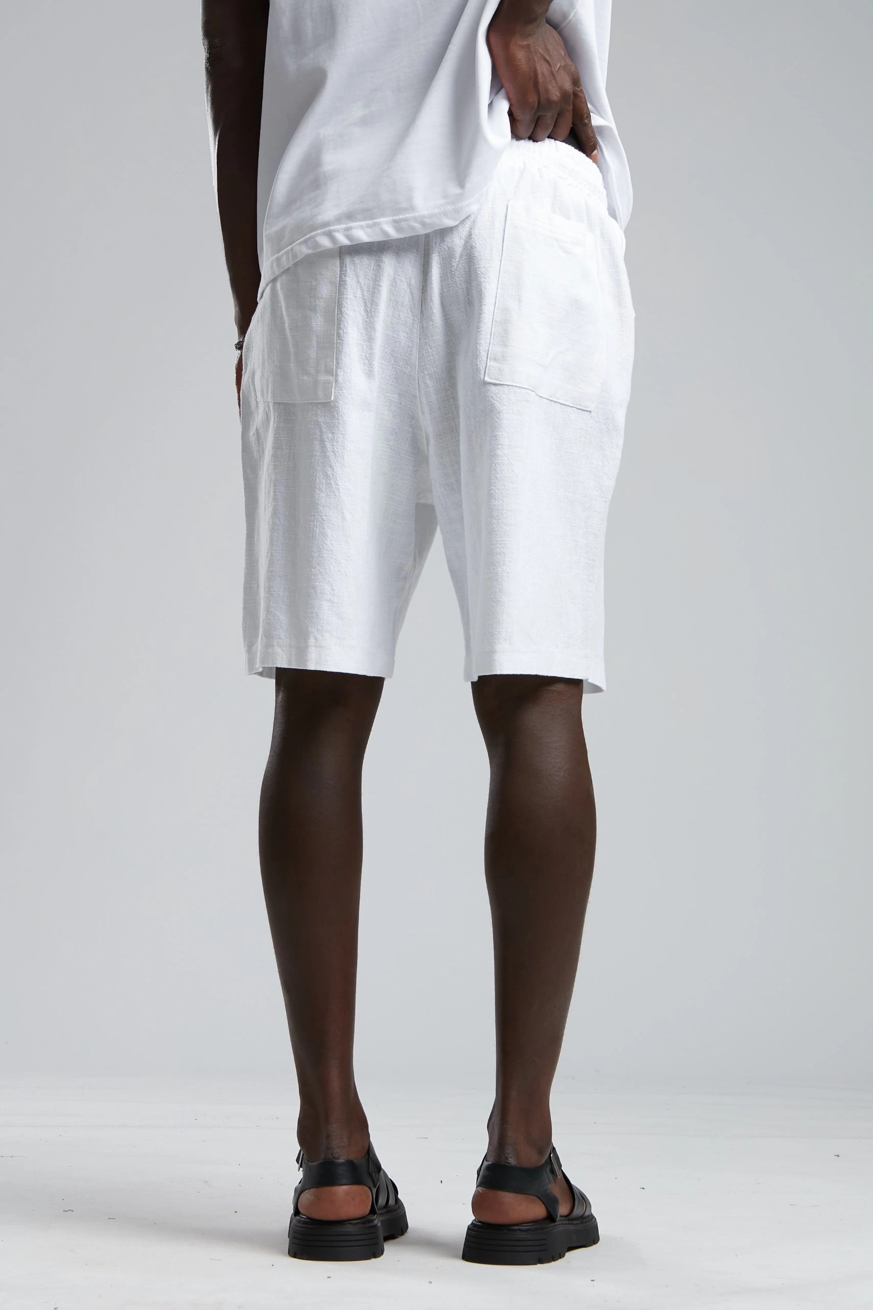 Erkek Beli Lastikli Keten Şort-Beyaz