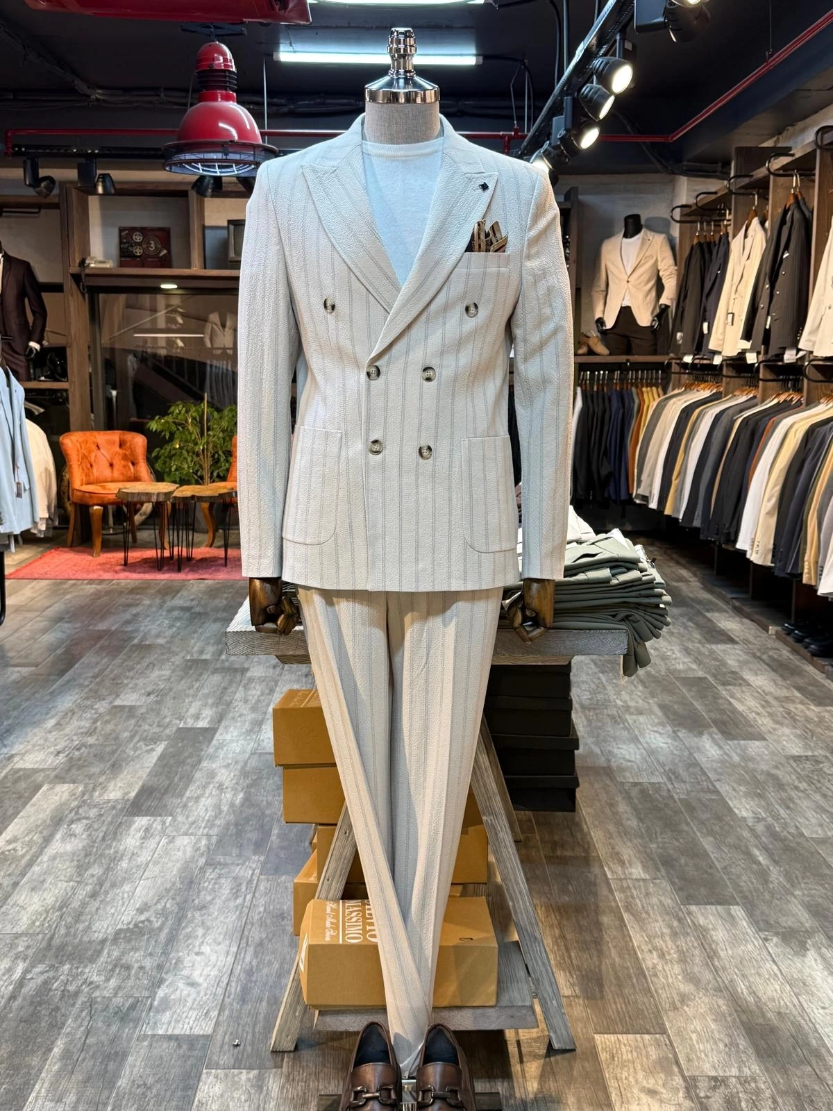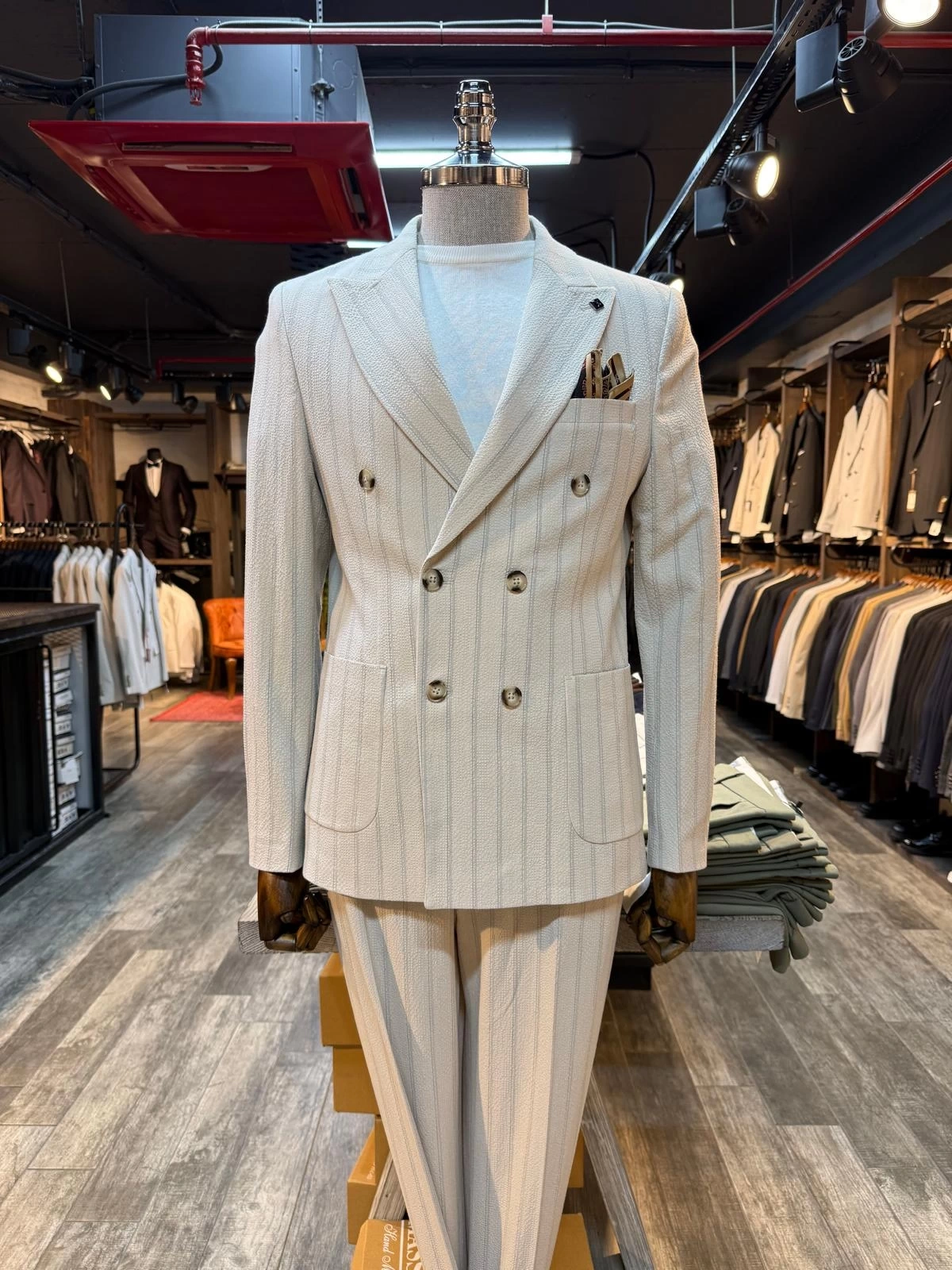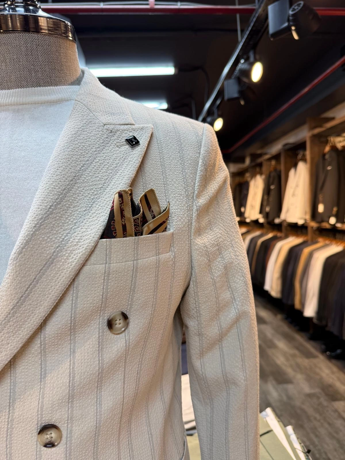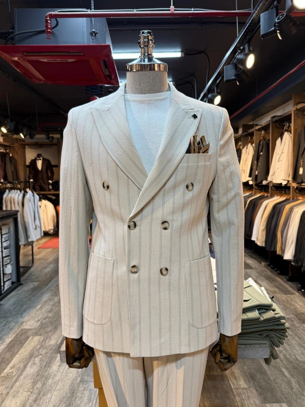 Erkek Dar Kesim Gofre Kumaş Çizgili Takım Elbise -Krem
