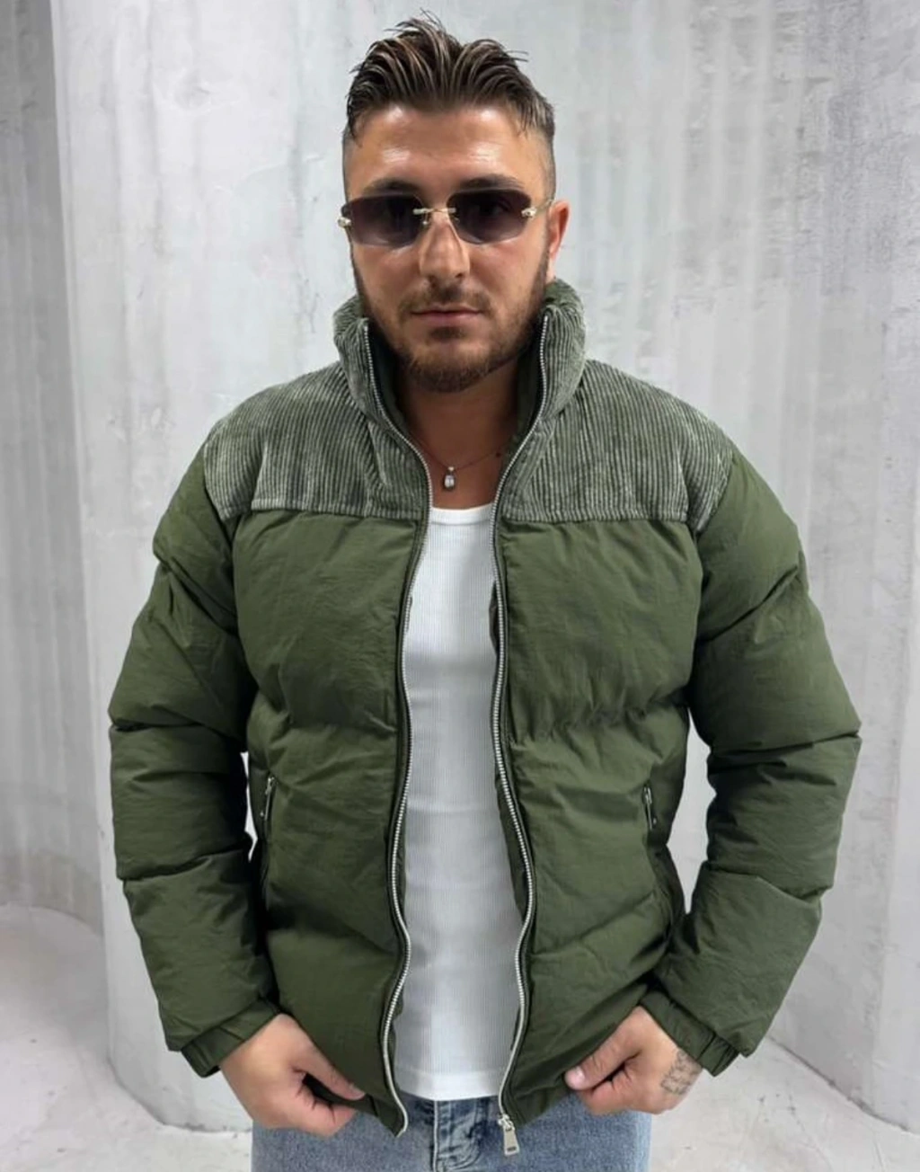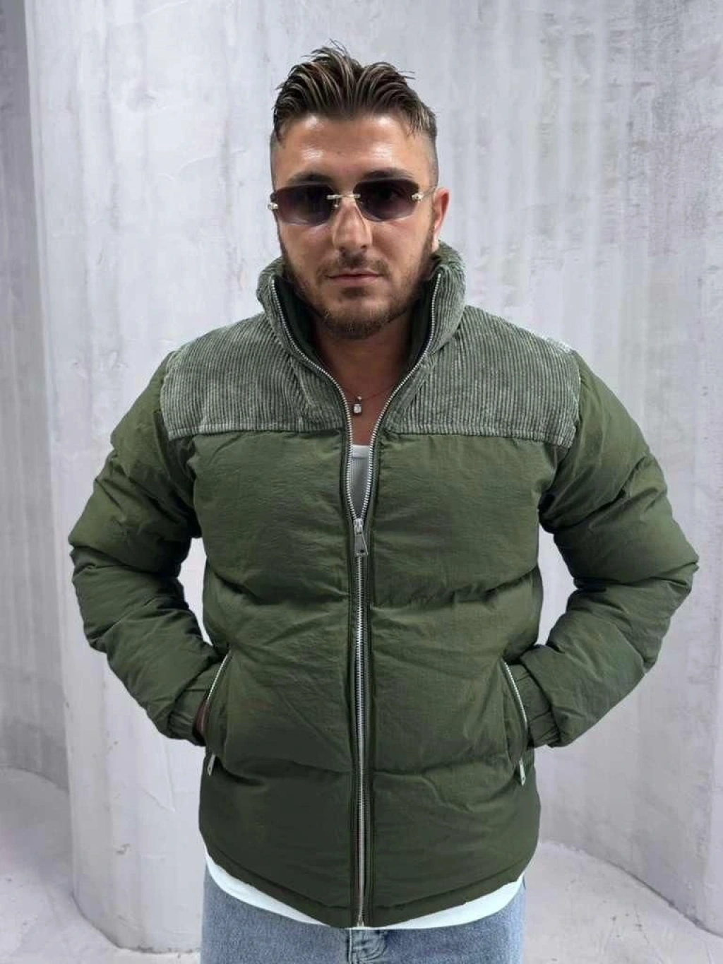 Erkek Dar Kesim Hakim Yaka Fermuarlı Şişme Mont-Yeşil