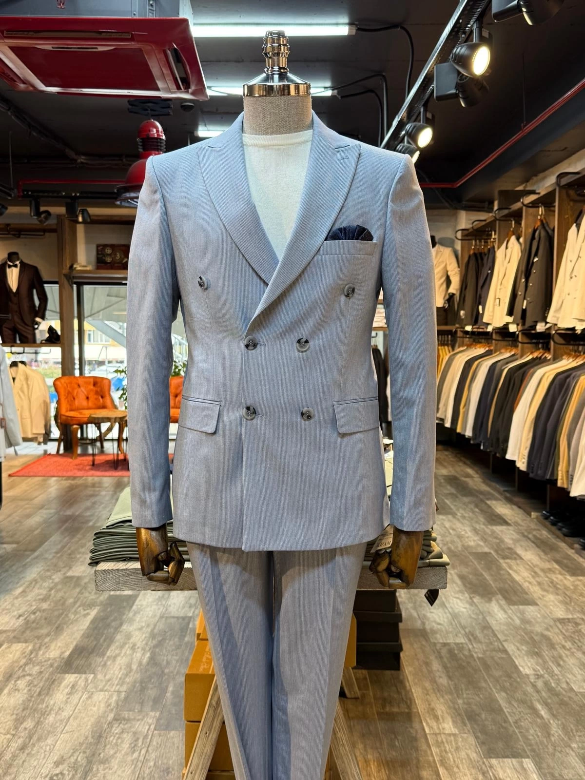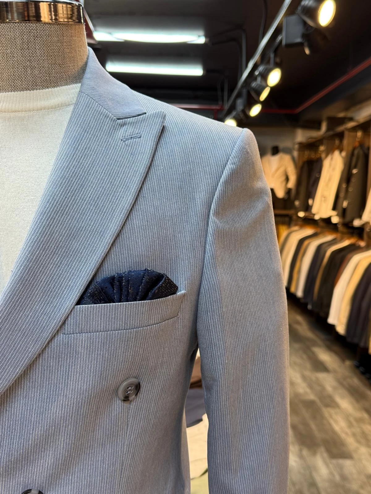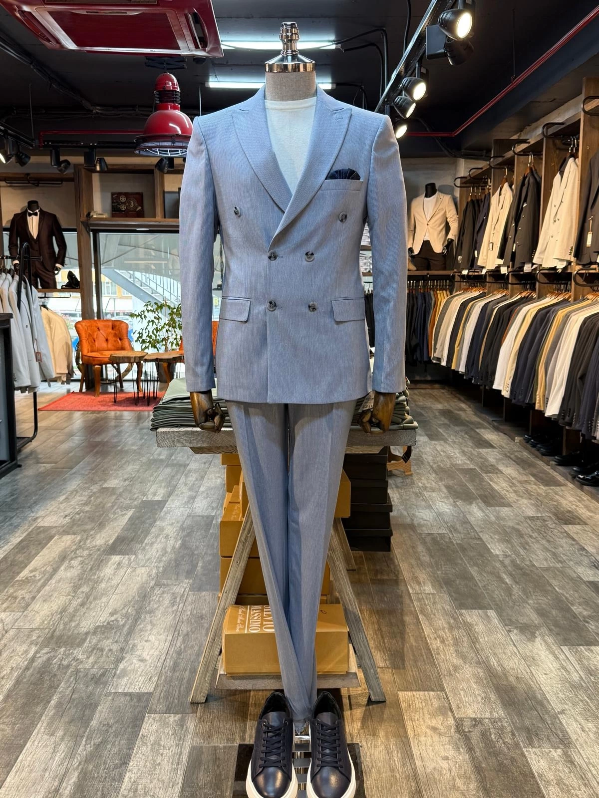 Erkek Dar Kesim Kruvaze Kendinden Çizgili Takım Elbise -Mavi