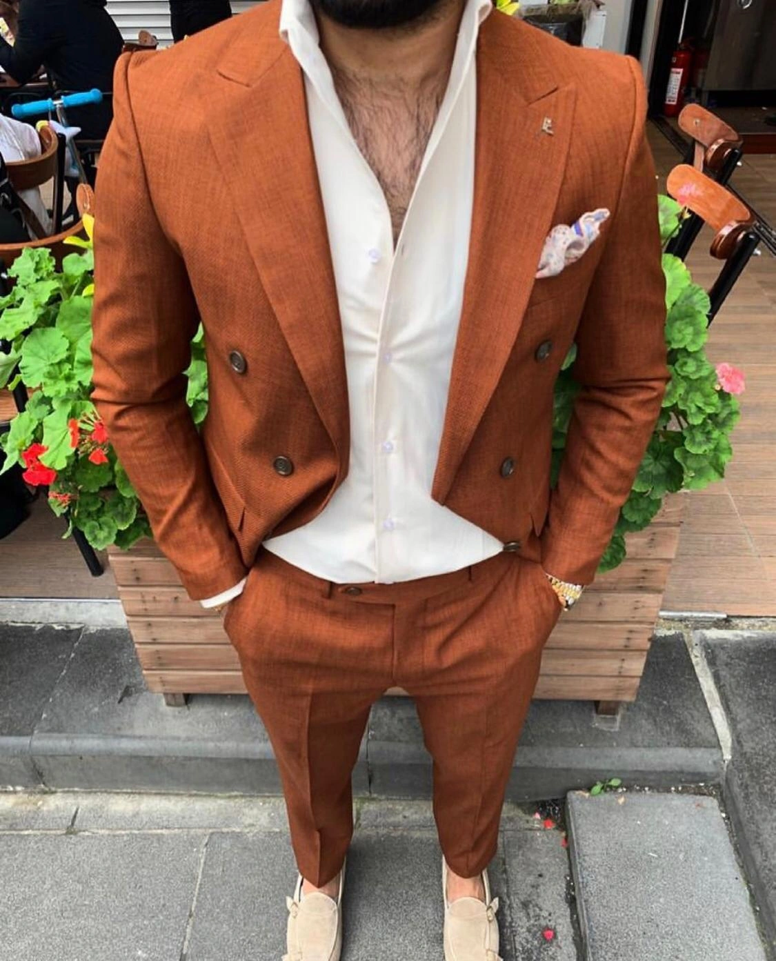 Erkek Dar Kesim Kruvaze Likralı Takım Elbise-Kiremit