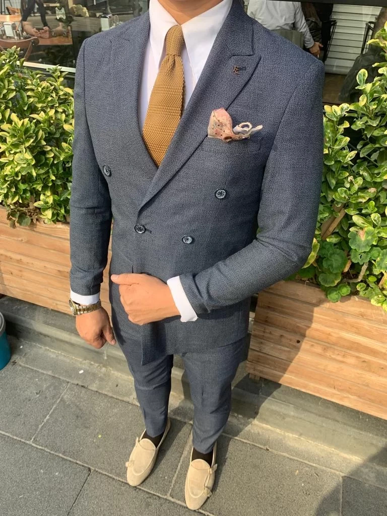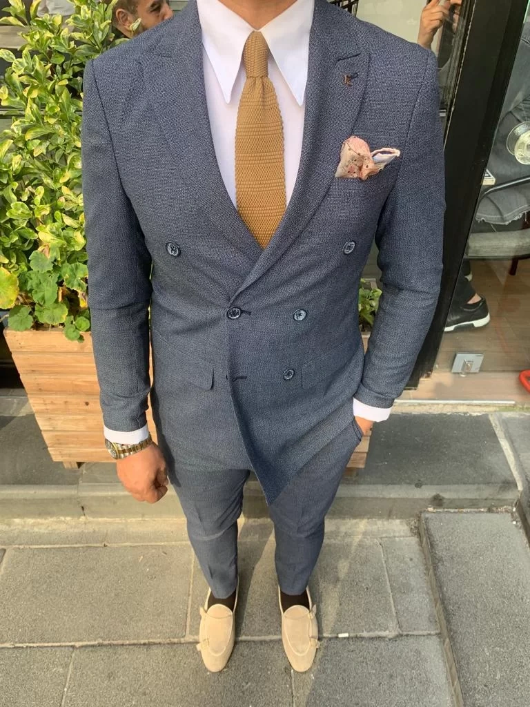 Erkek Dar Kesim Silimfit Kruvaze Takım Elbise-Lacivert
