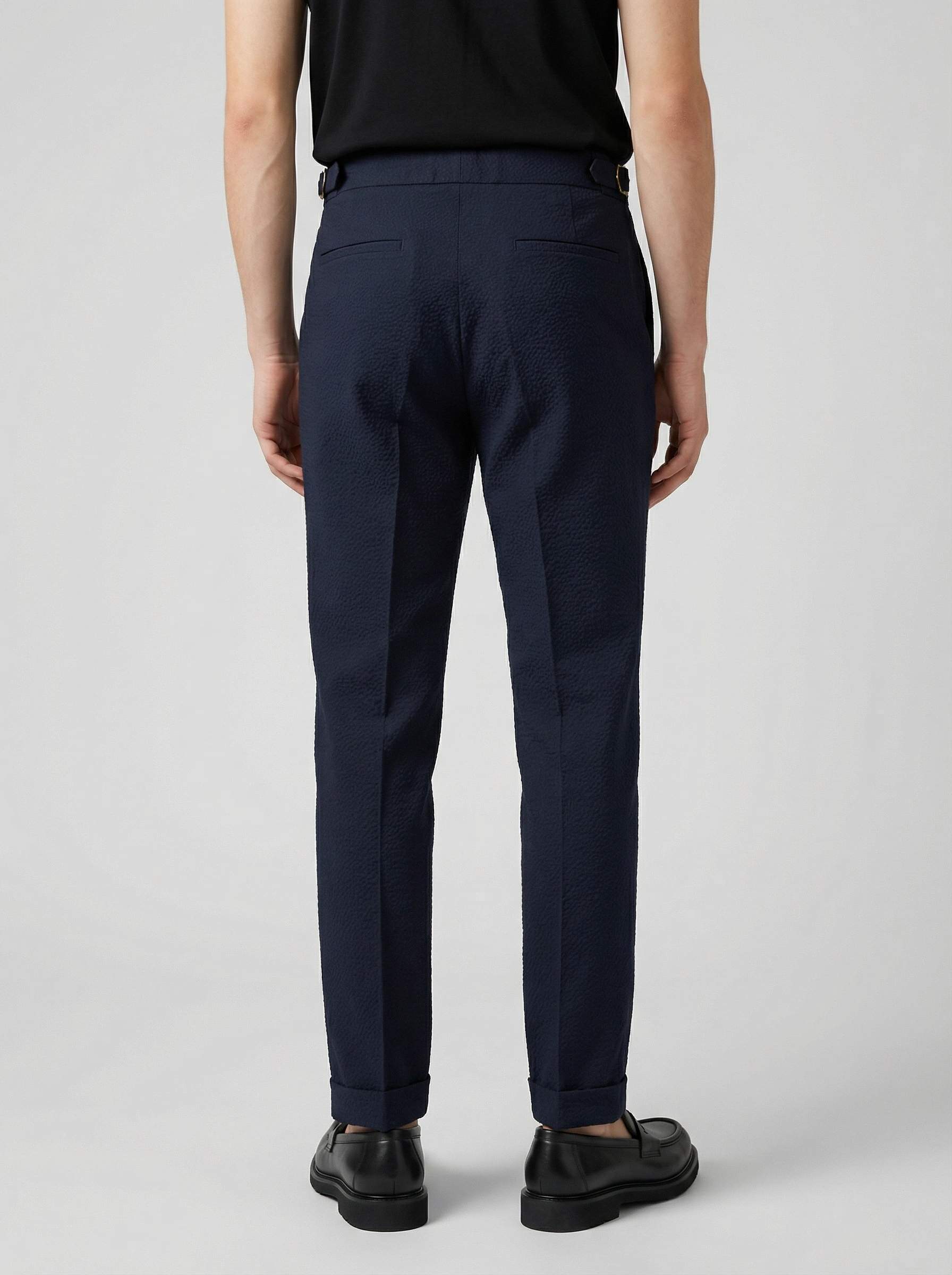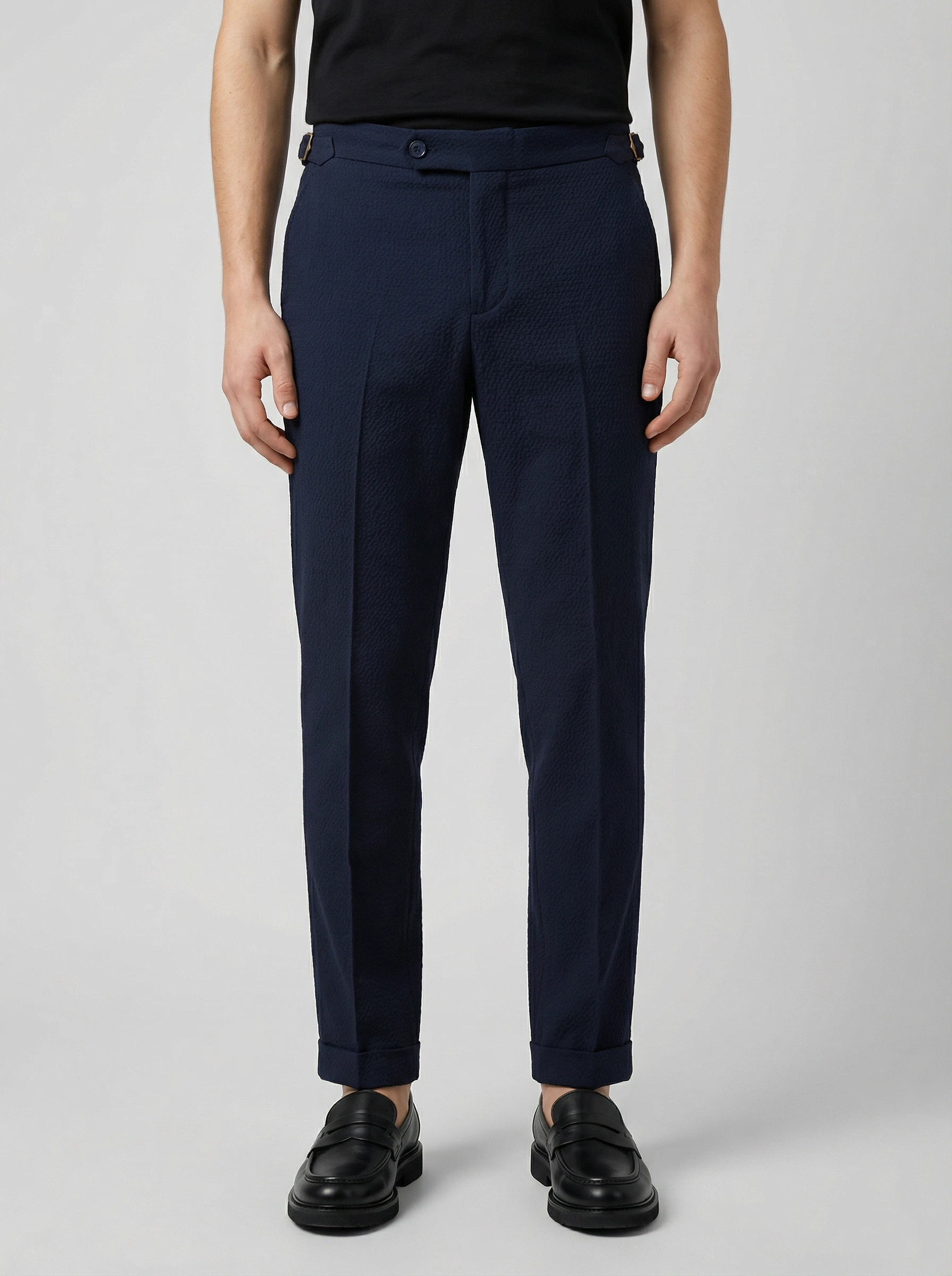 Erkek Dar Kesim Tokalı Yüksek Bel Pileli Duble Paça Gofre Kumaş Pantolon -Lacivert