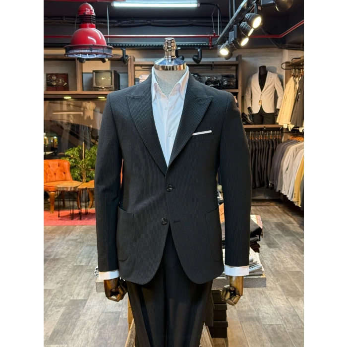 Erkek Dar Kesim Torba Cep Çift Dügme Takım Elbise-Siyah