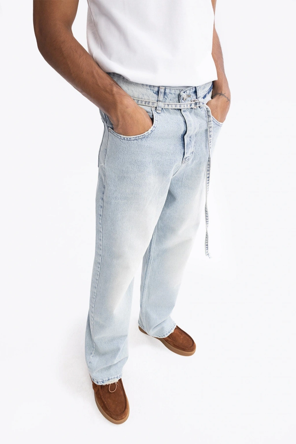 Erkek Geniş Kalıp Baggy Kemerli Kot Pantolon - Mavi