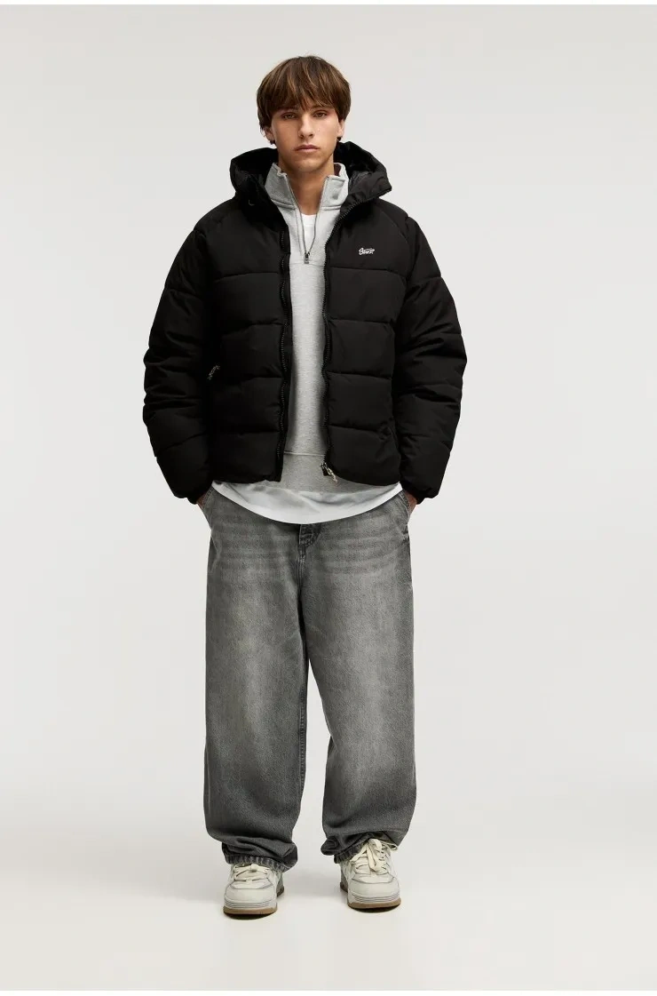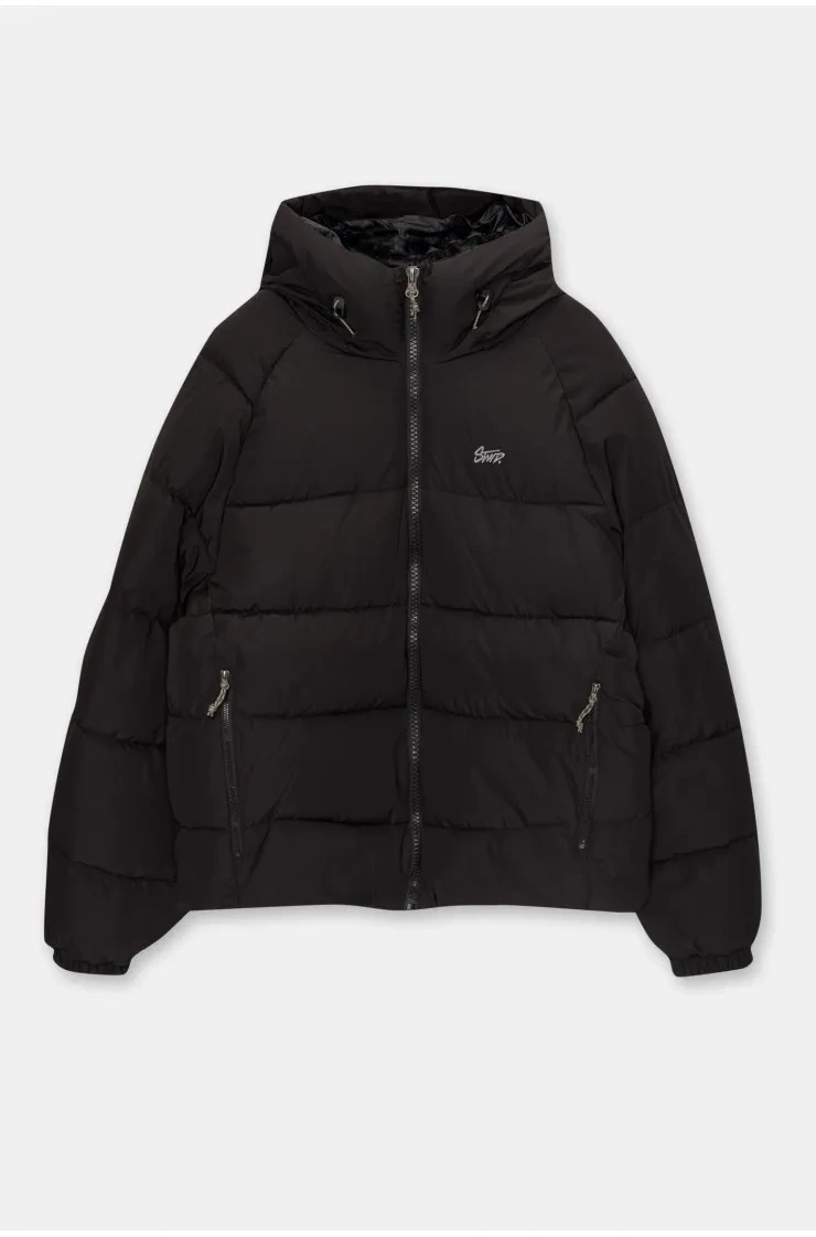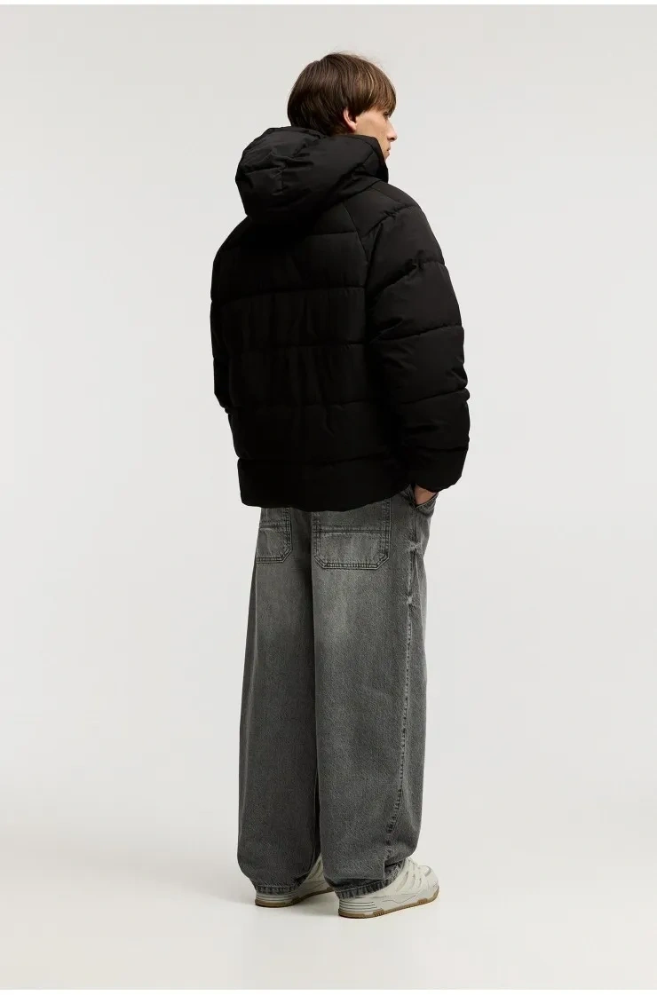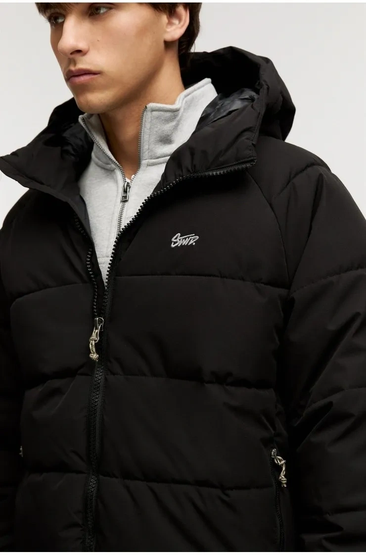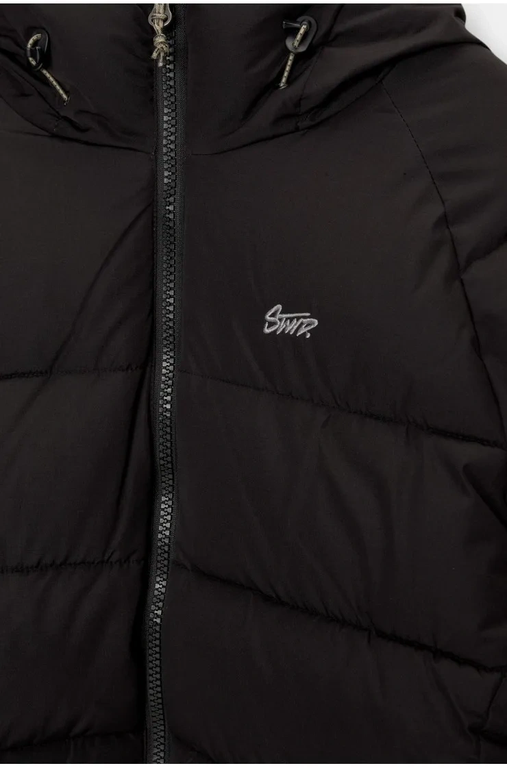 Erkek Kapüşonlu Fermuarlı Şişme Mont -Siyah