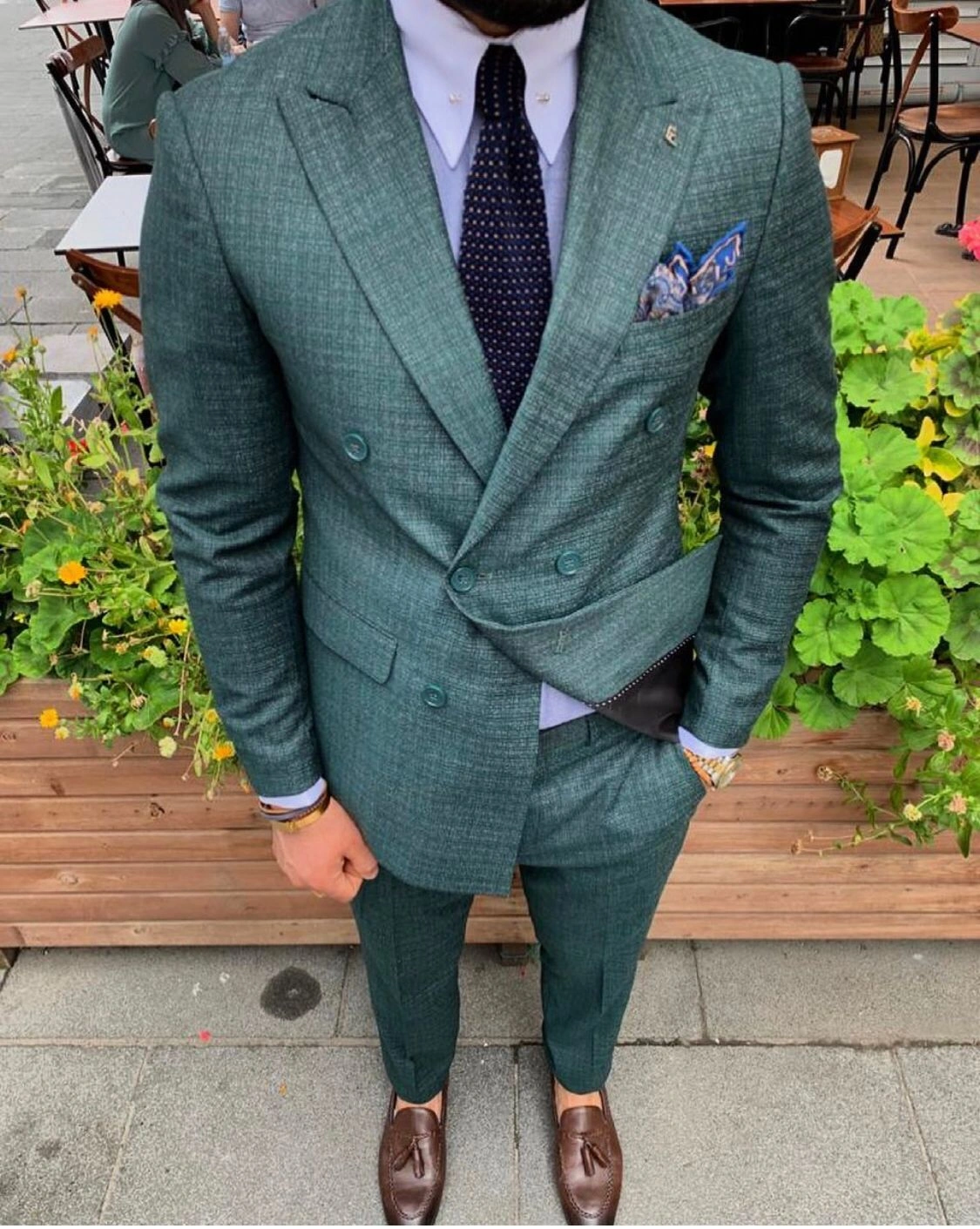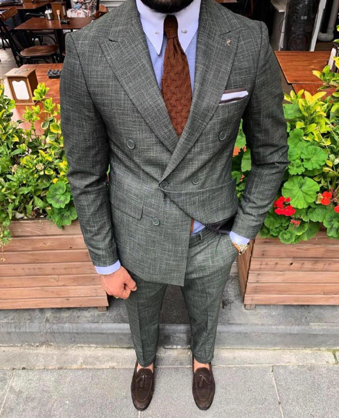 Erkek Kruvaze Model Dar Kesim Desenli Likralı Takım Elbise-Gri