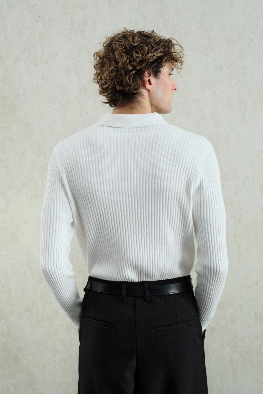 Erkek Normal Kesim Polo Yaka Kendinden Çizgili Triko -Beyaz