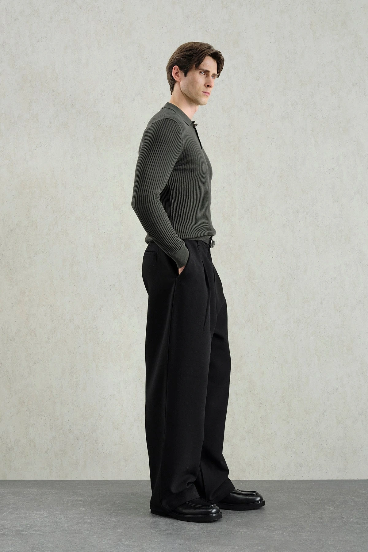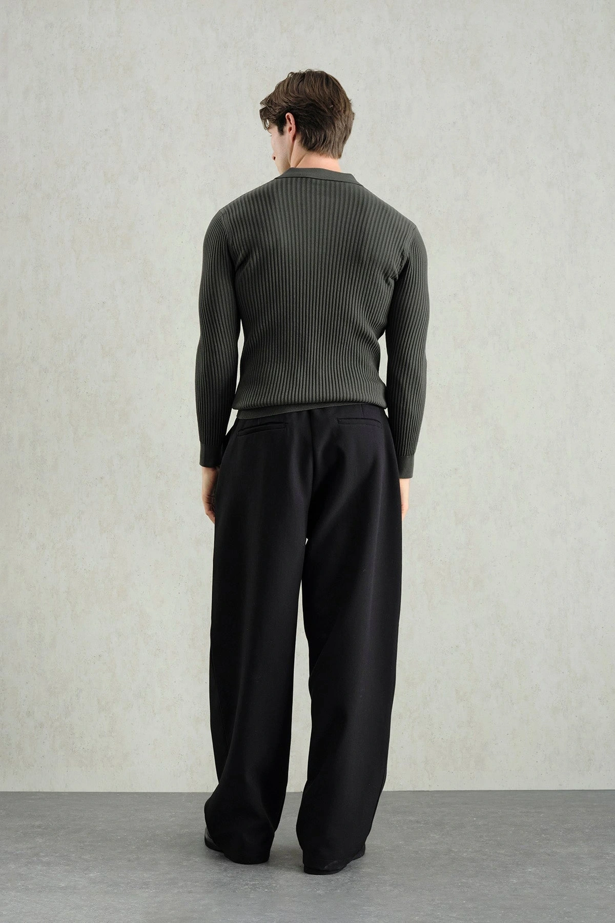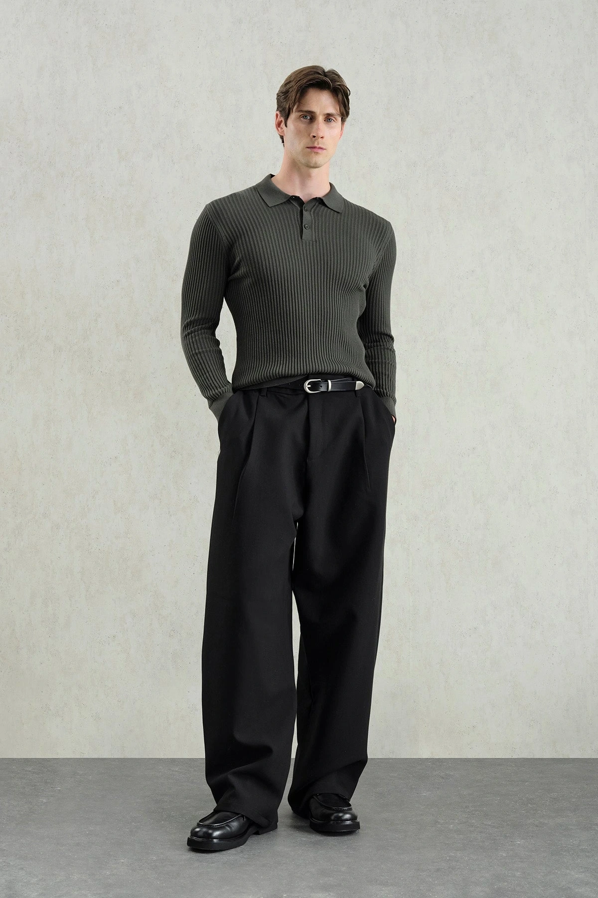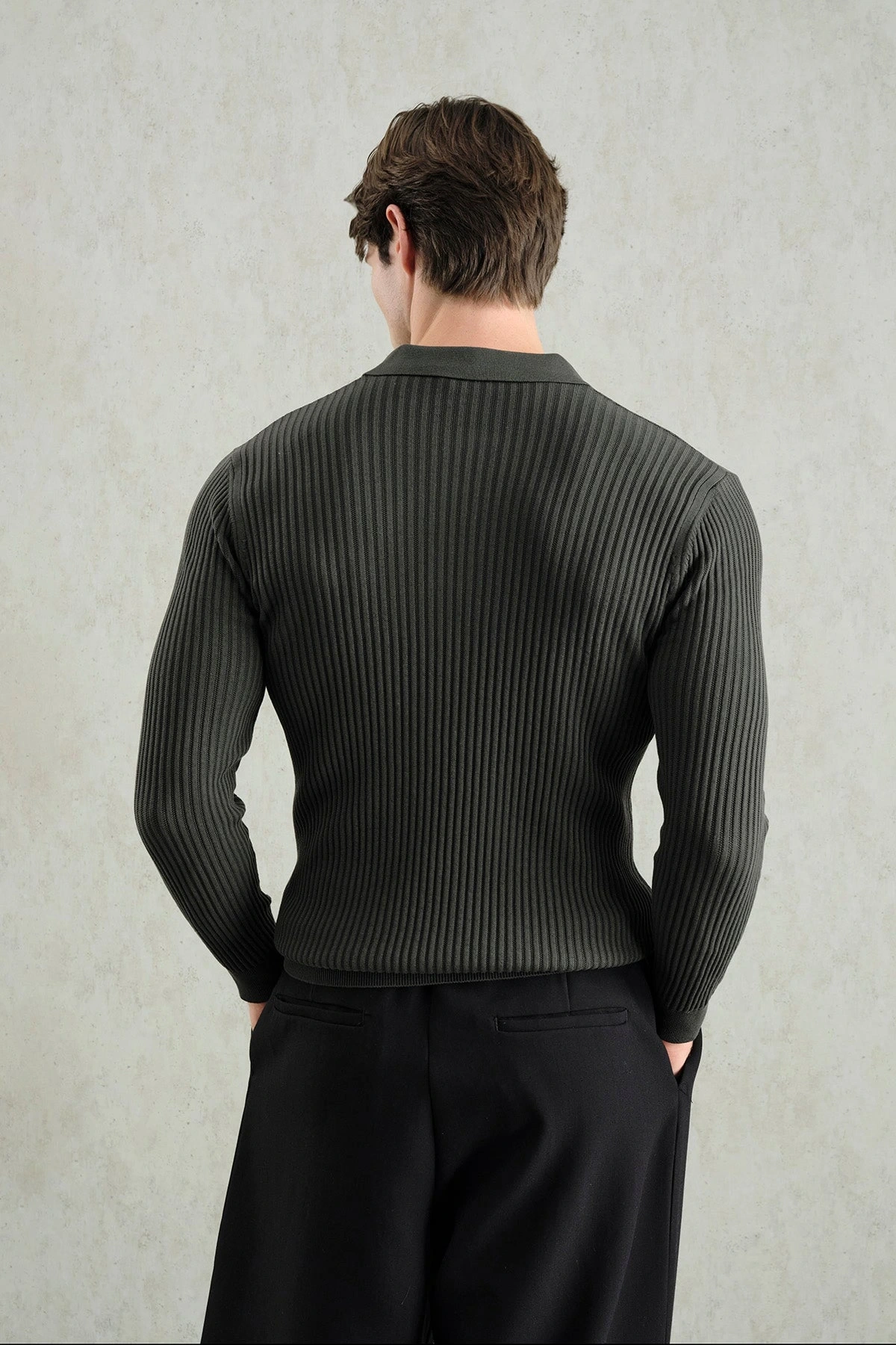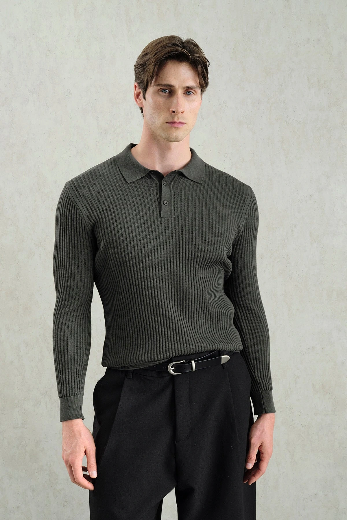 Erkek Normal Kesim Polo Yaka Kendinden Çizgili Triko -Gri