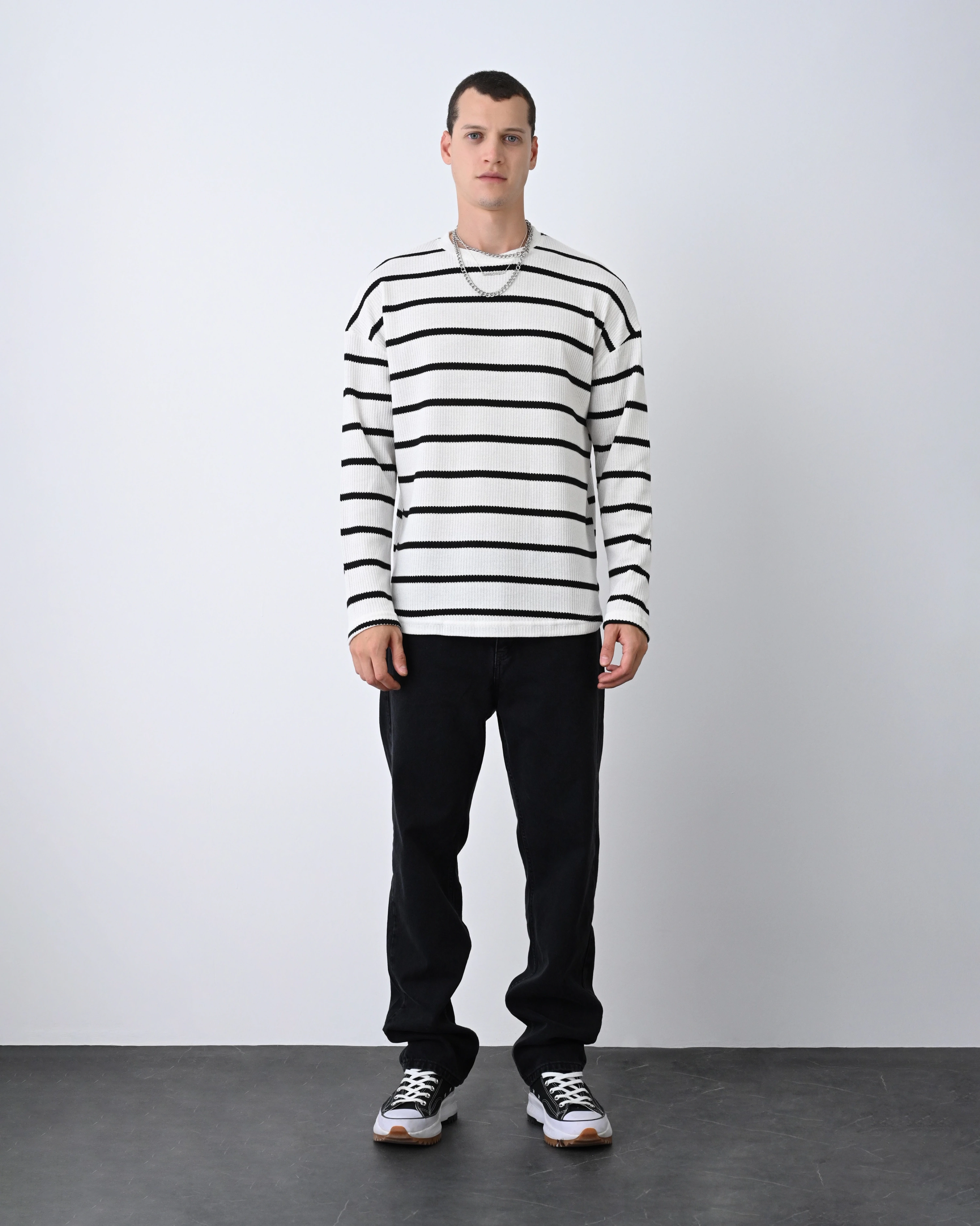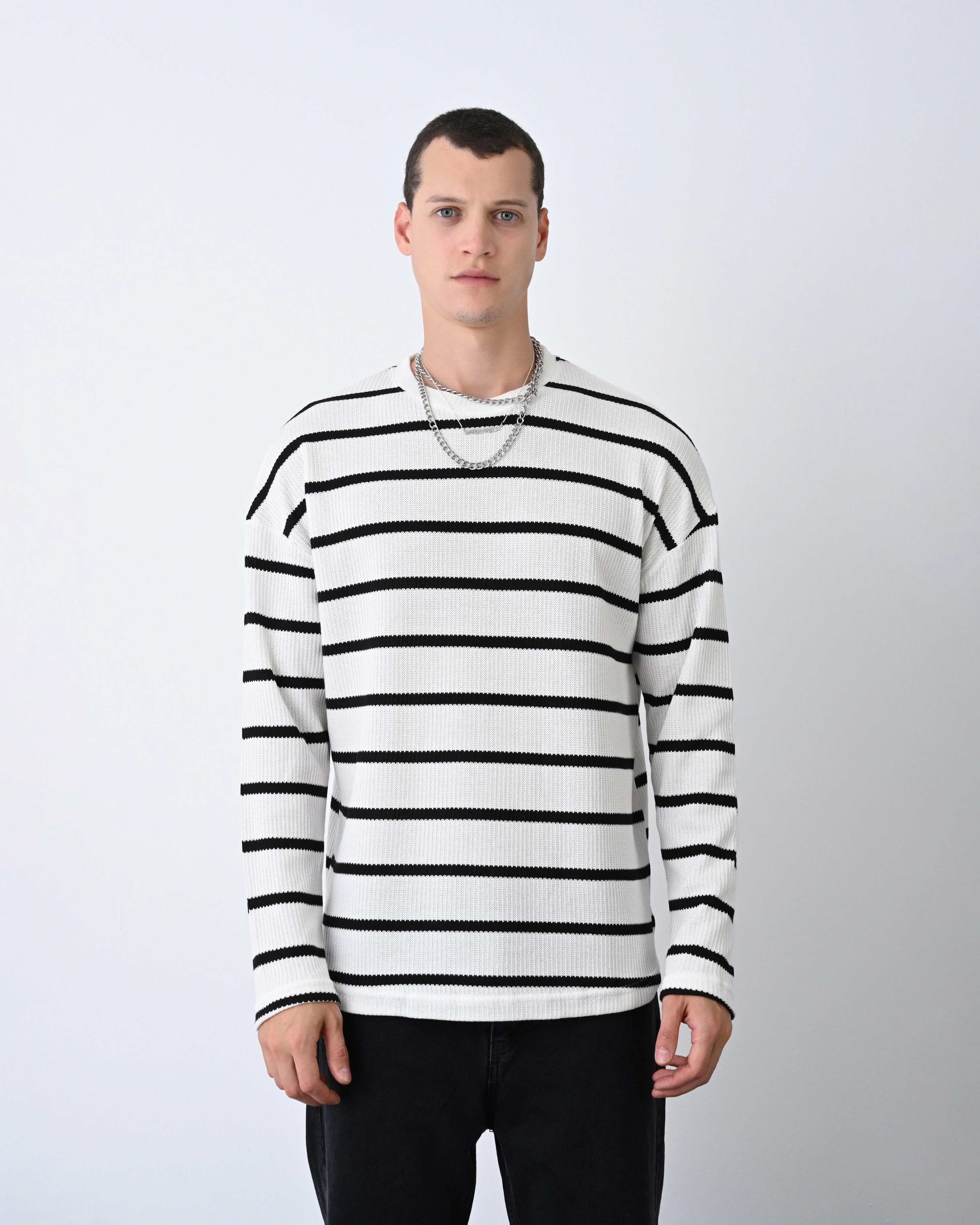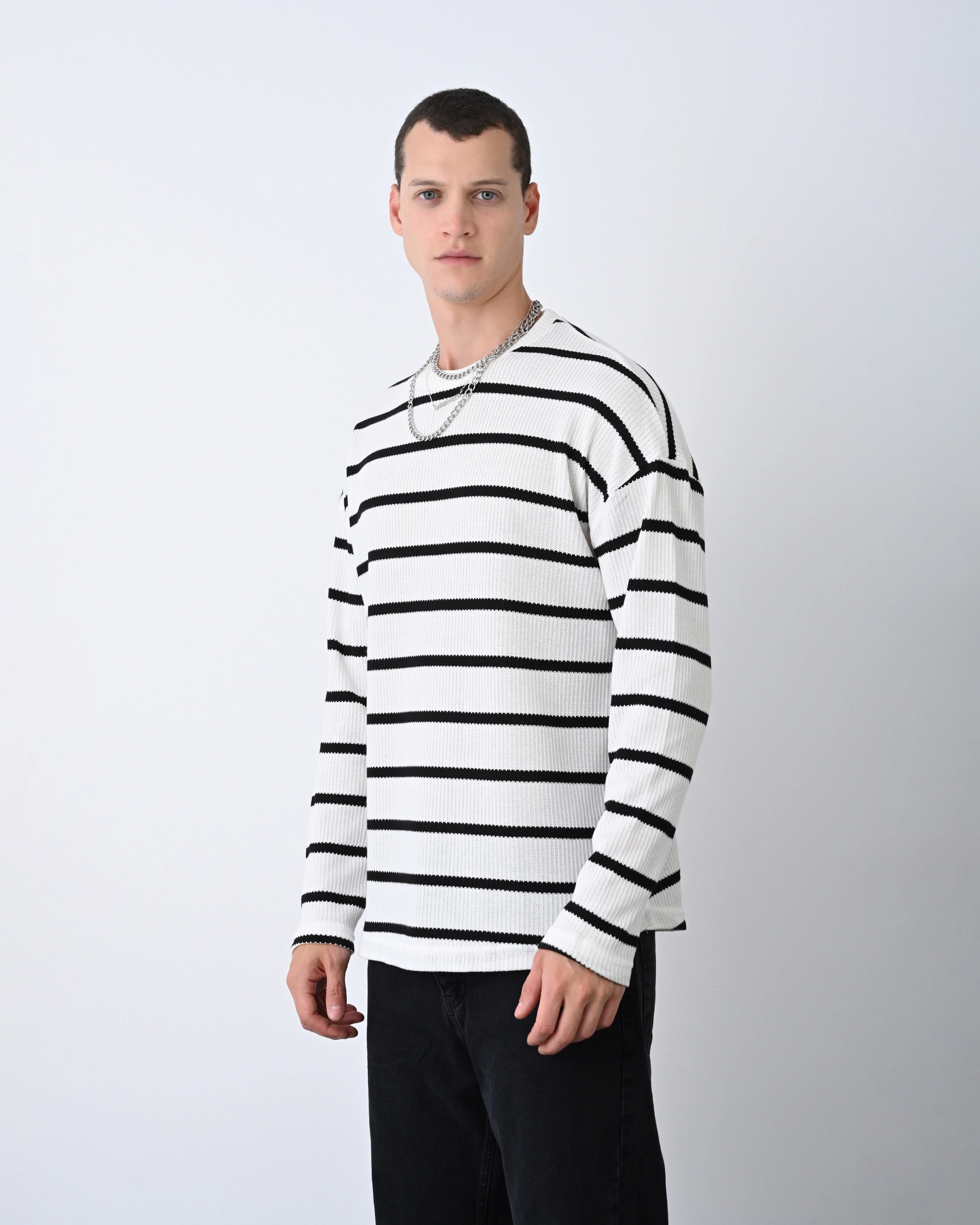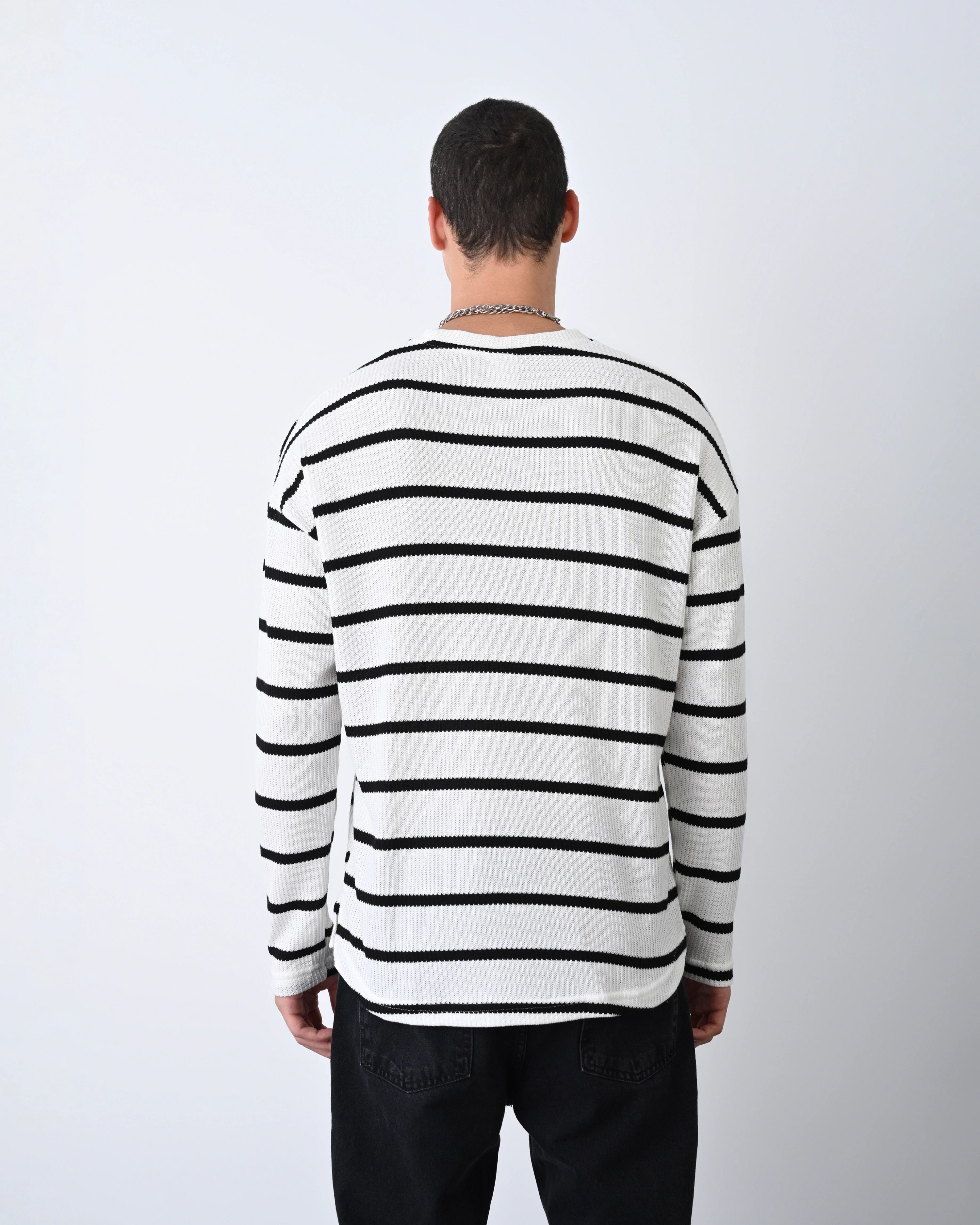 Erkek Owersize Bisiklet Örme İnce Triko-Beyaz-Siyah