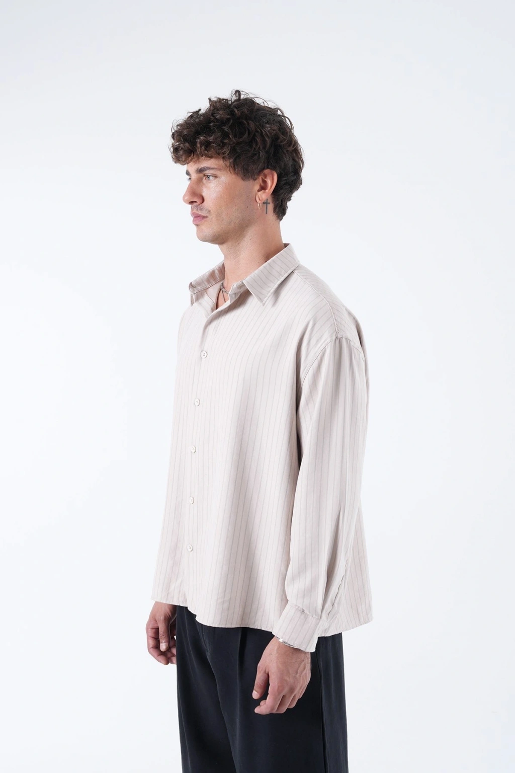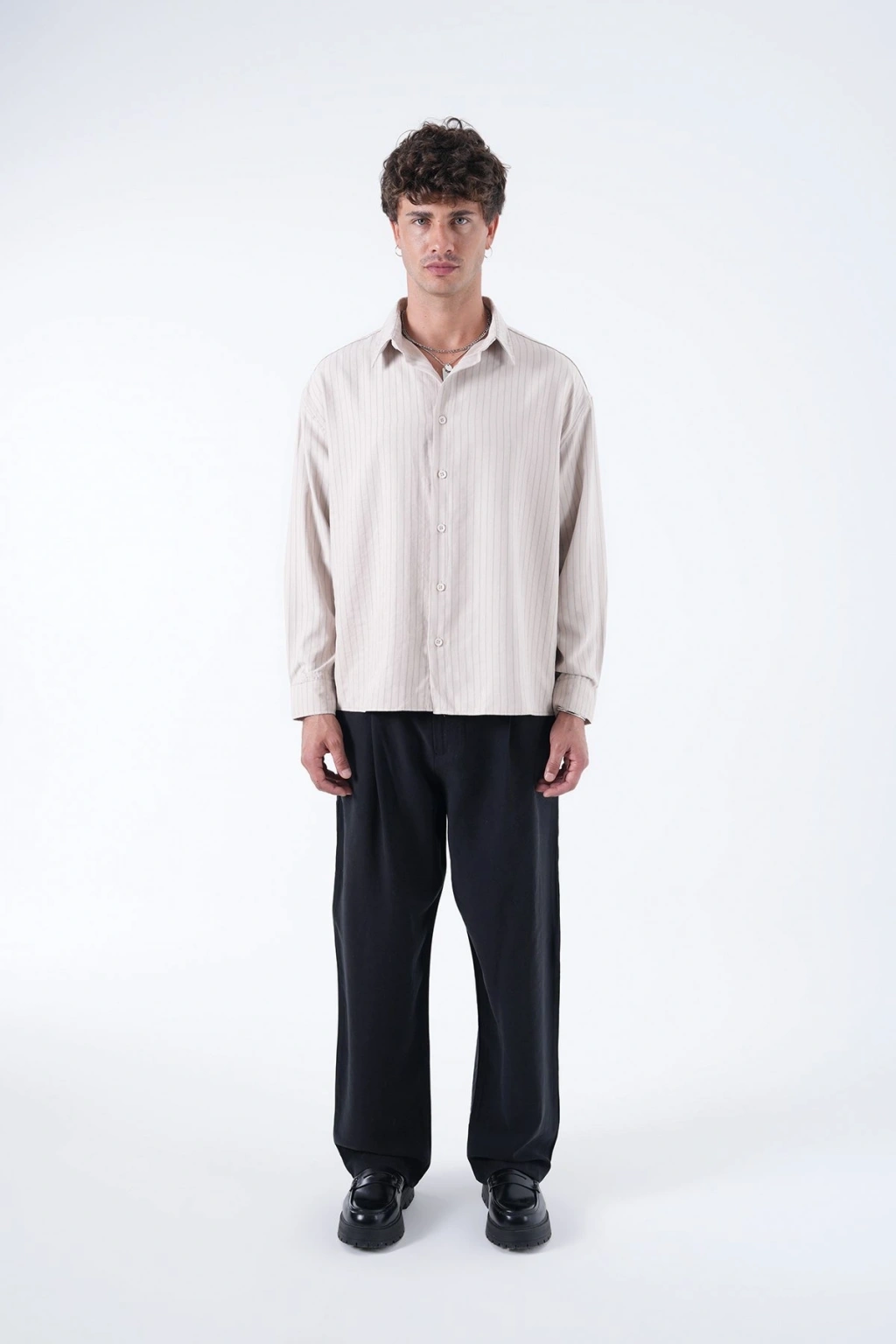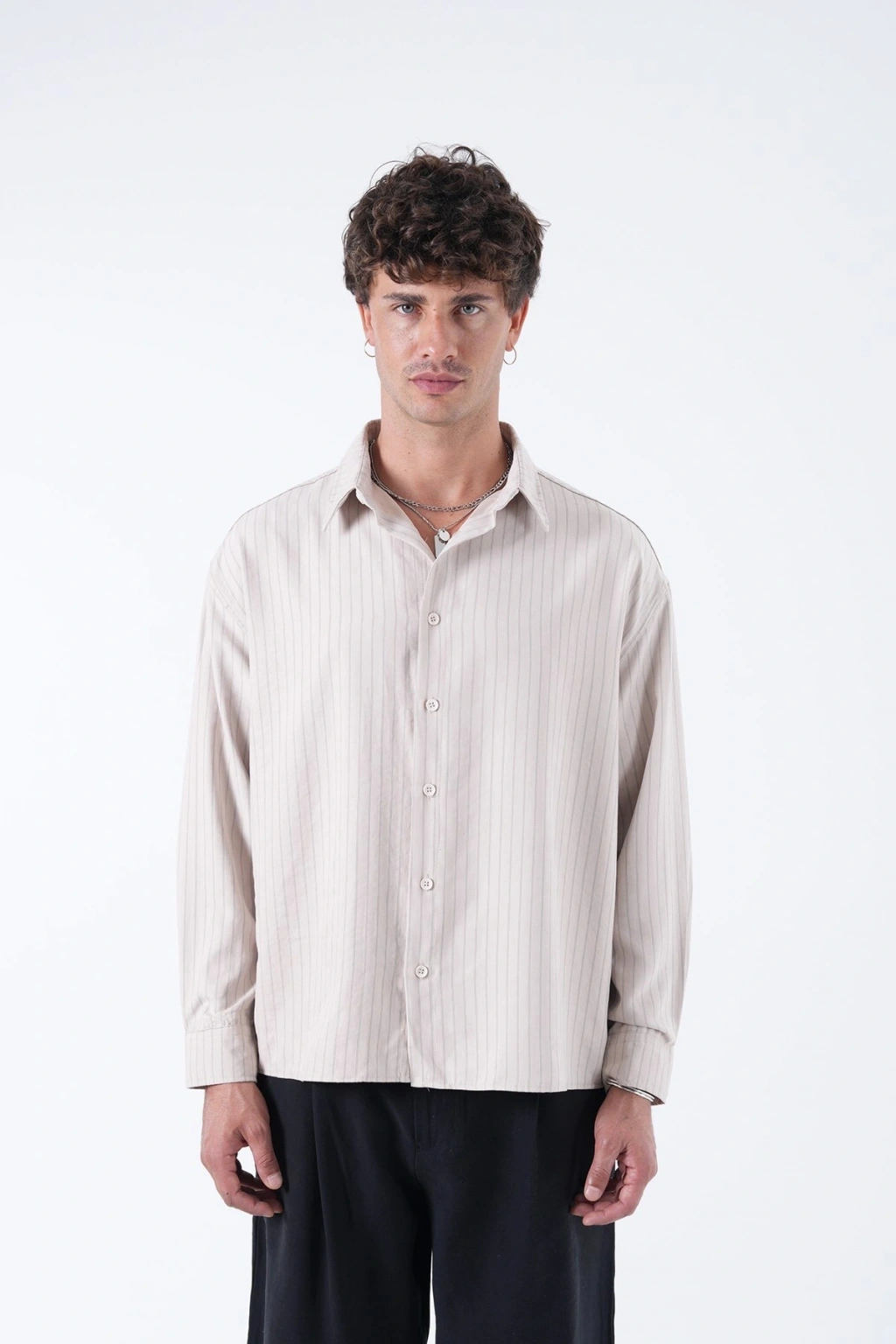 Erkek Owersize Çizgili Pamuklu Gömlek- Krem