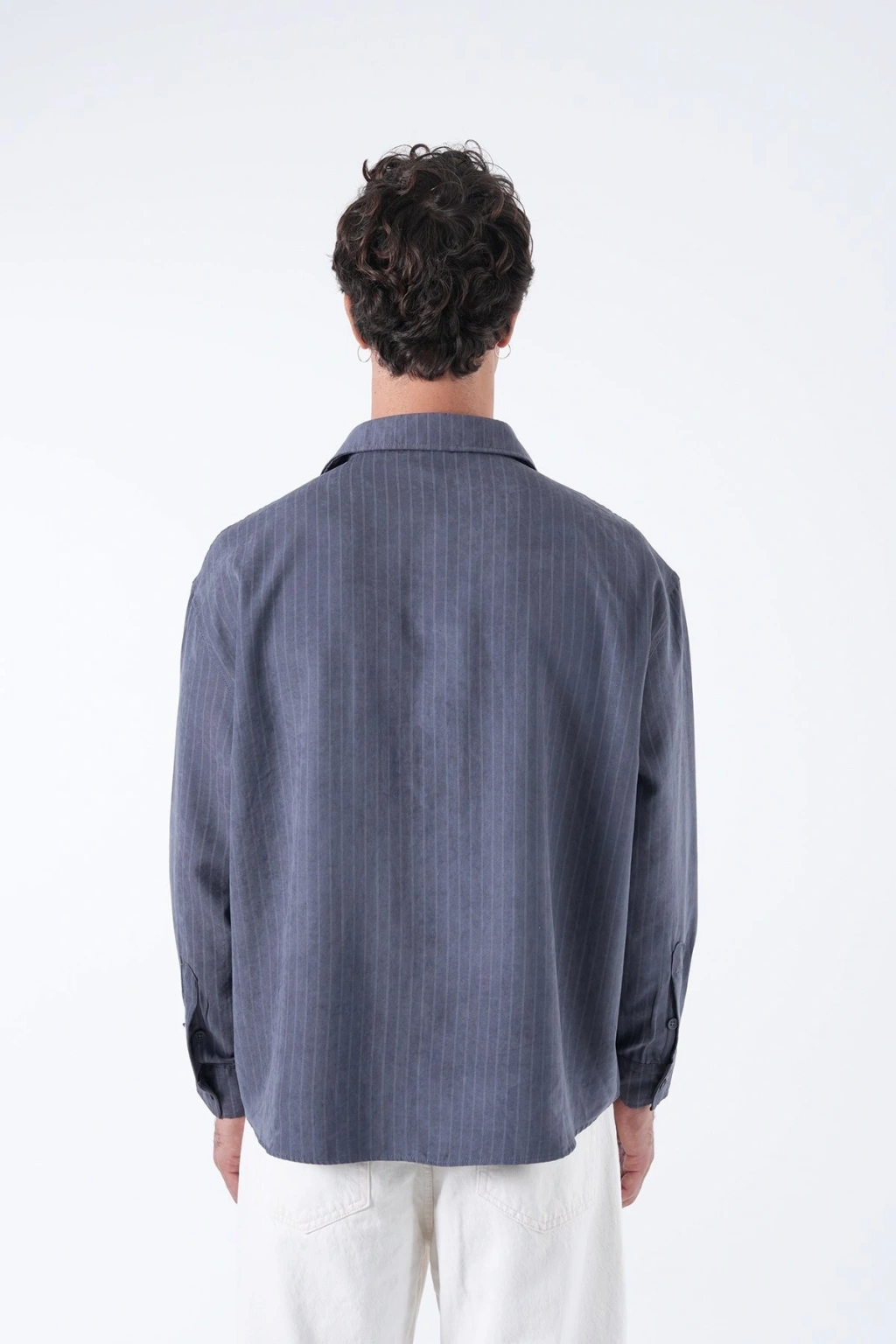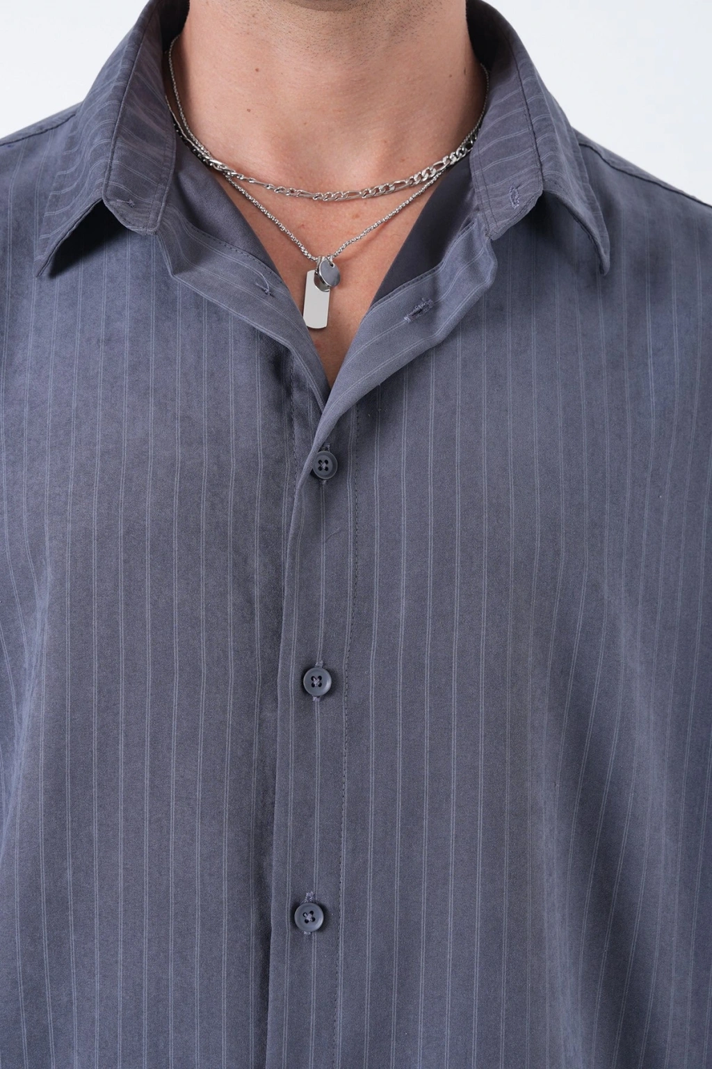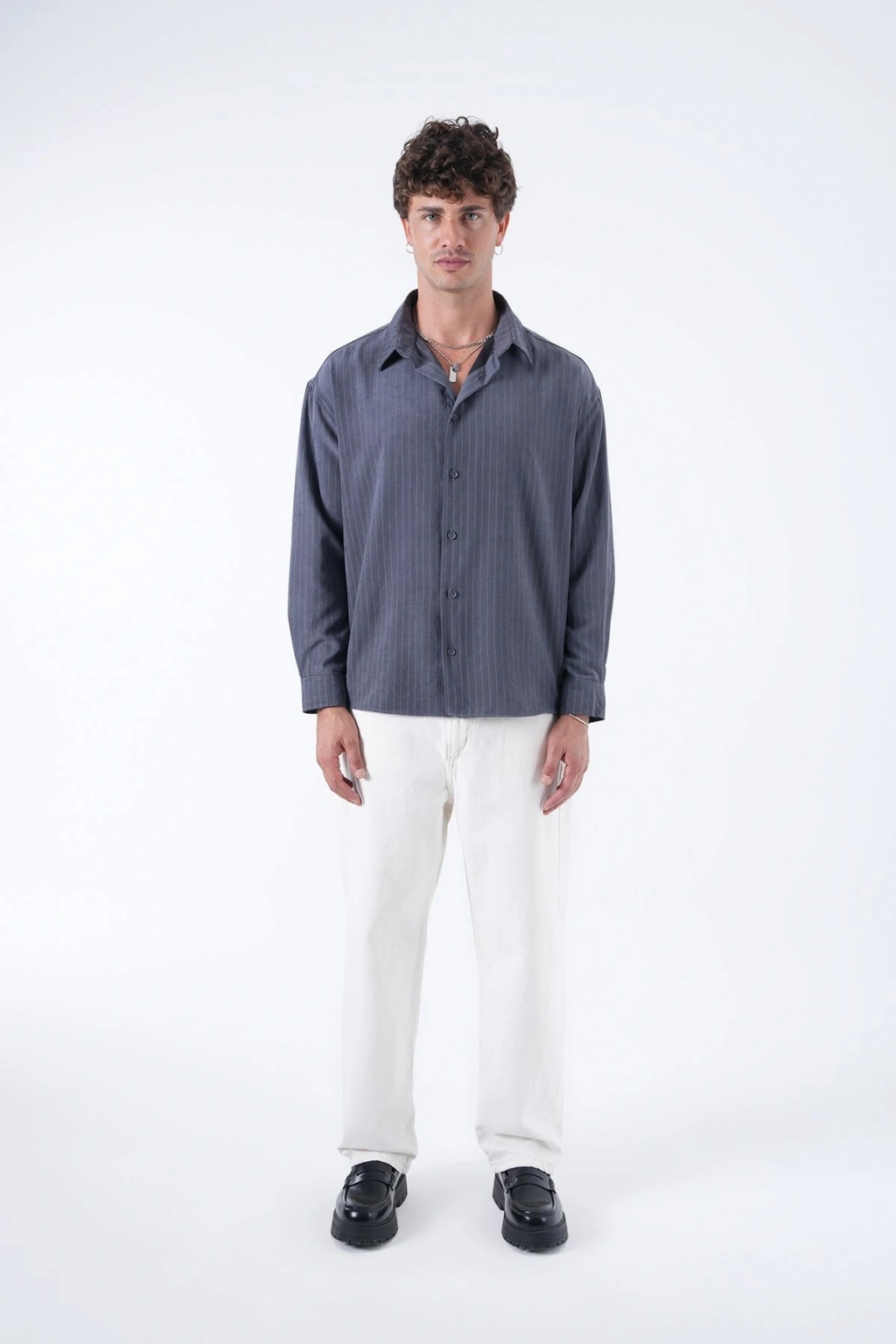 Erkek Owersize Çizgili Pamuklu Gömlek- Lacivert
