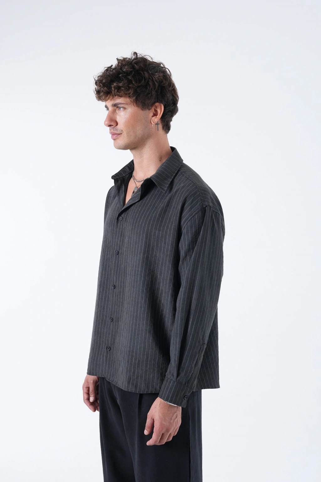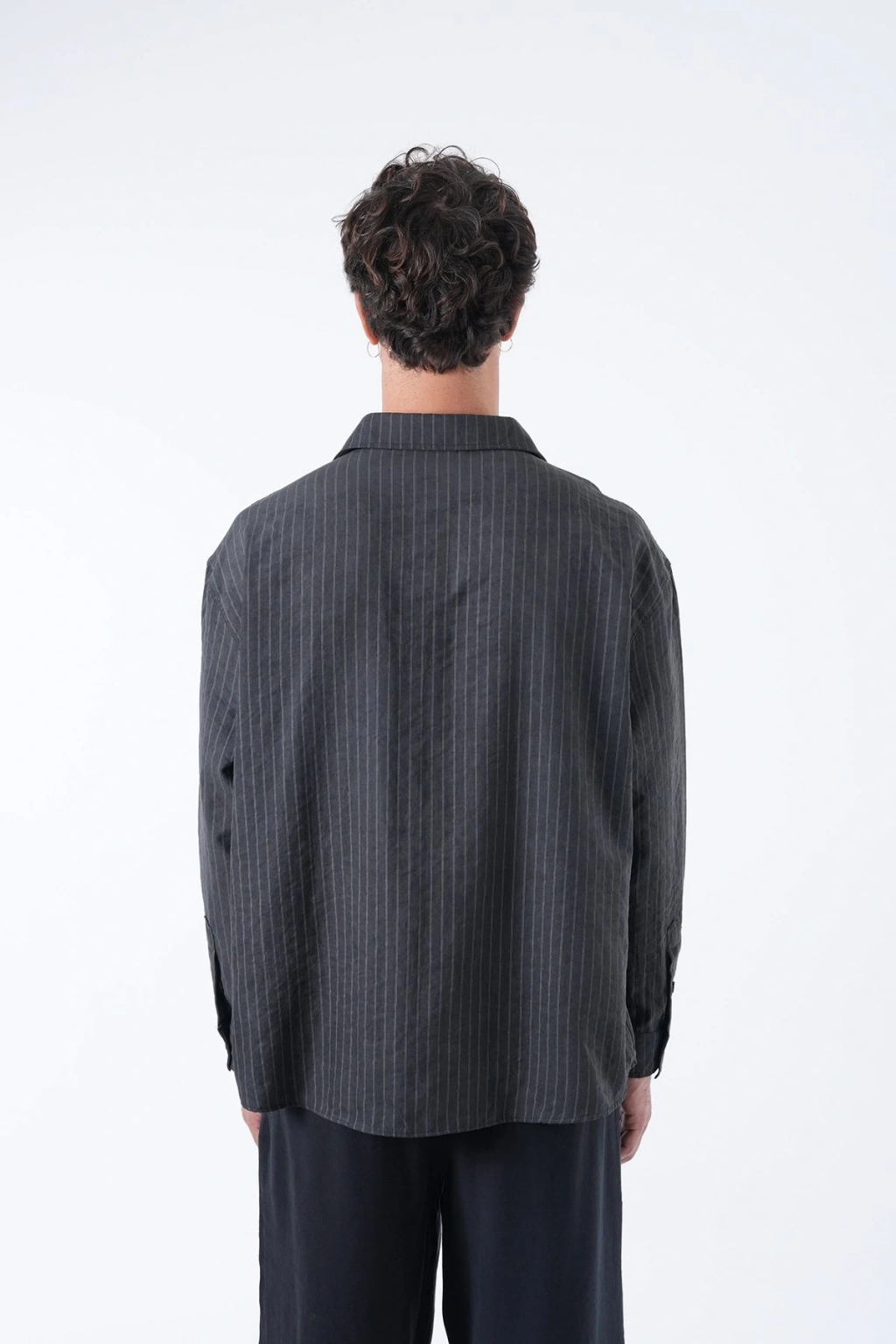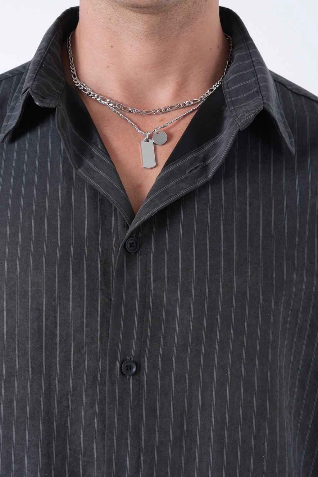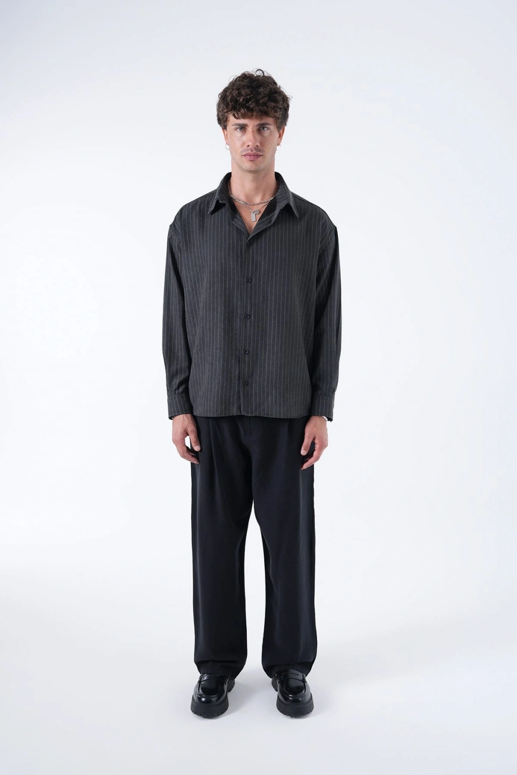 Erkek Owersize Çizgili Pamuklu Gömlek- Siyah