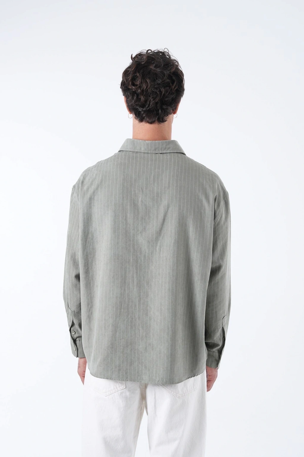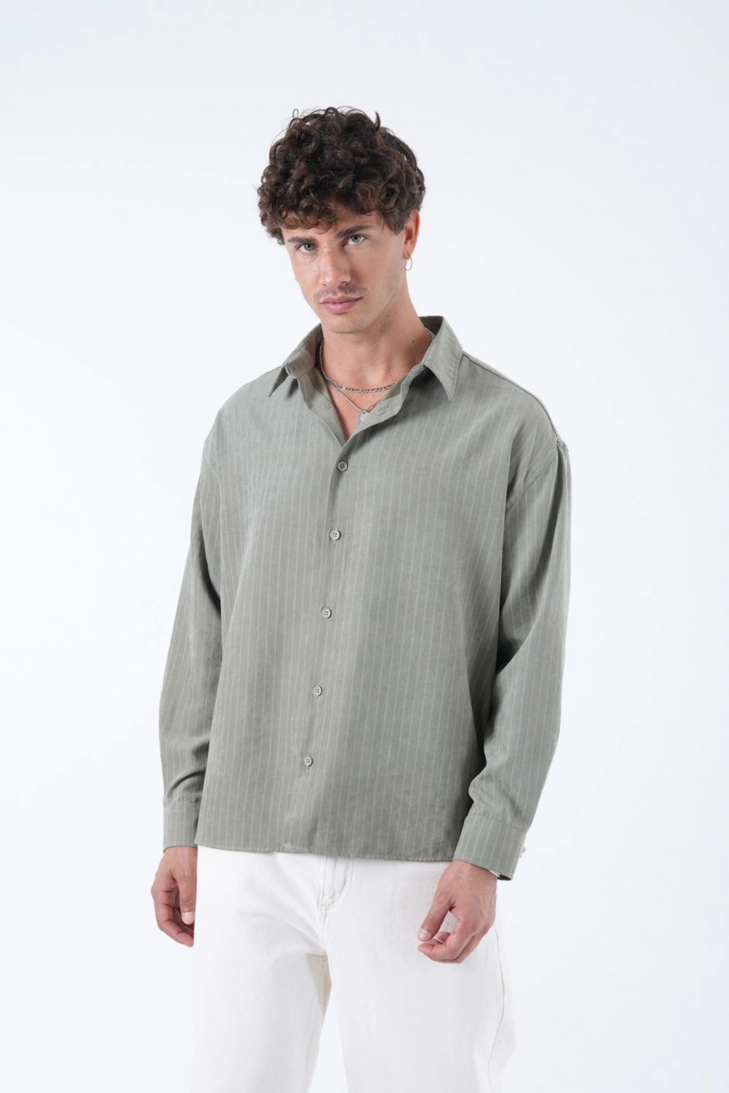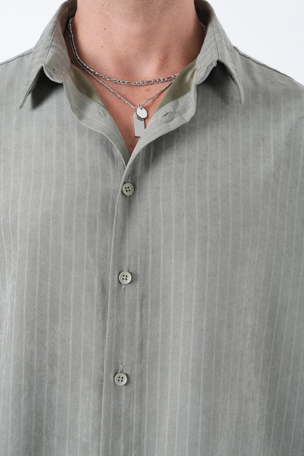 Erkek Owersize Çizgili Pamuklu Gömlek- Yeşil