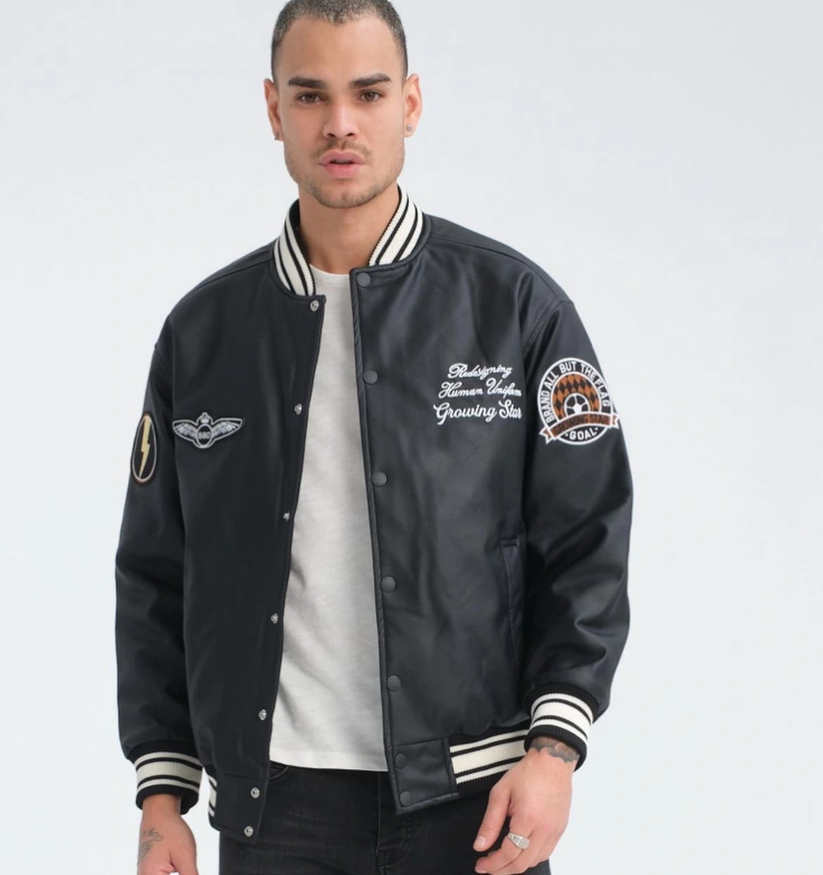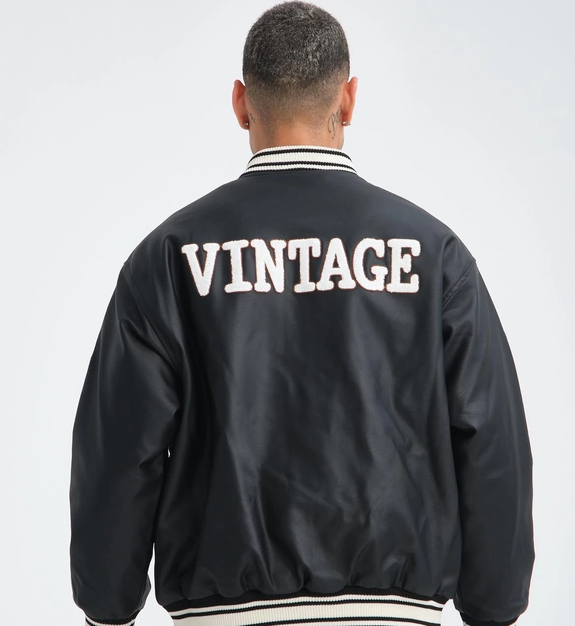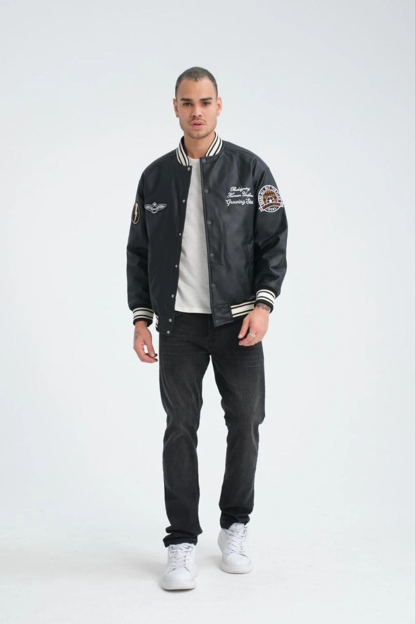Erkek Owersıze Deri Kolej Mont - Siyah