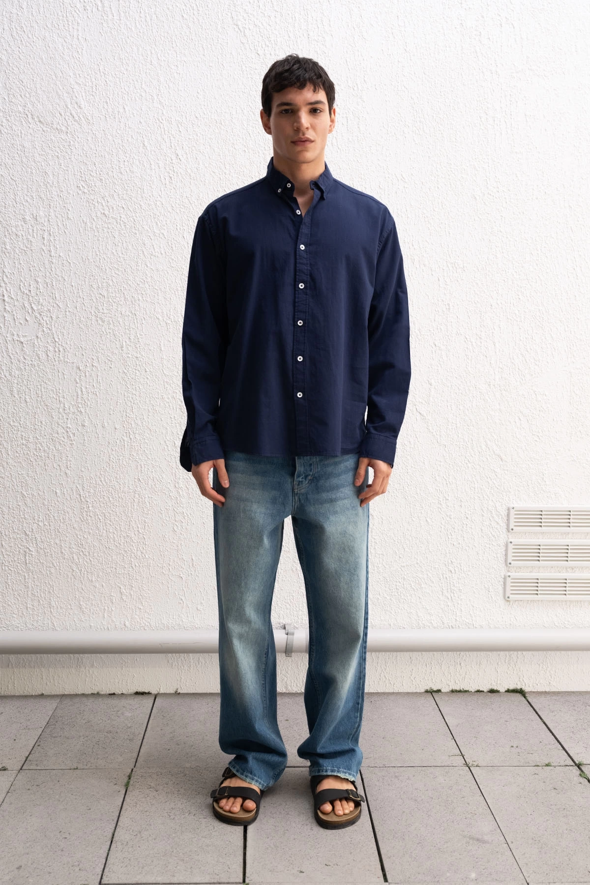 Rahat kesim, uzun kollu, oversize dökümlü gömlek.