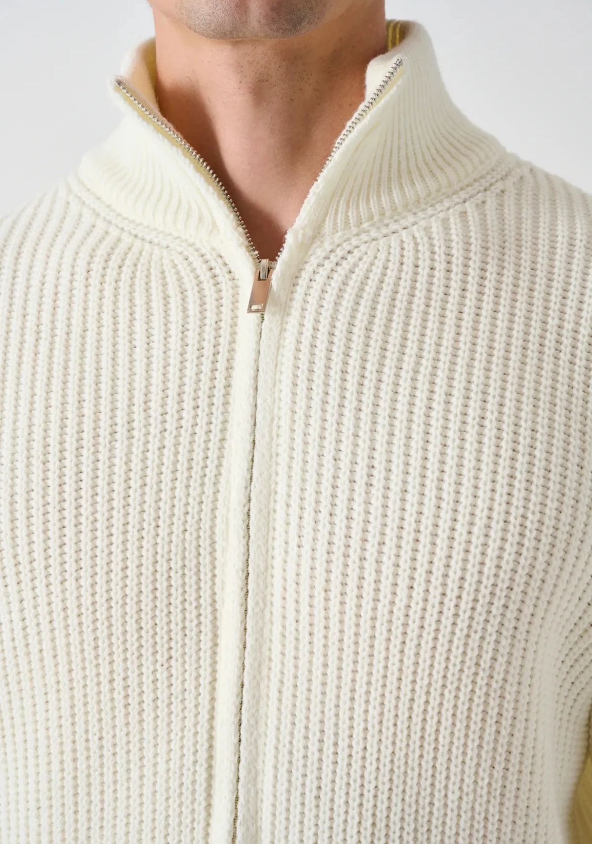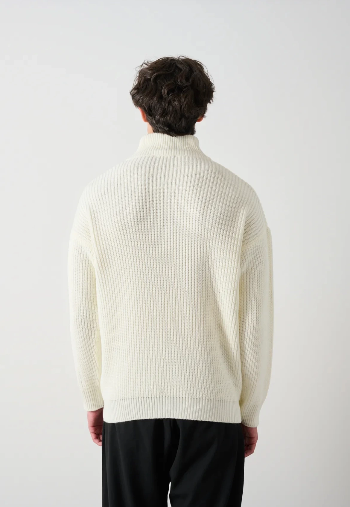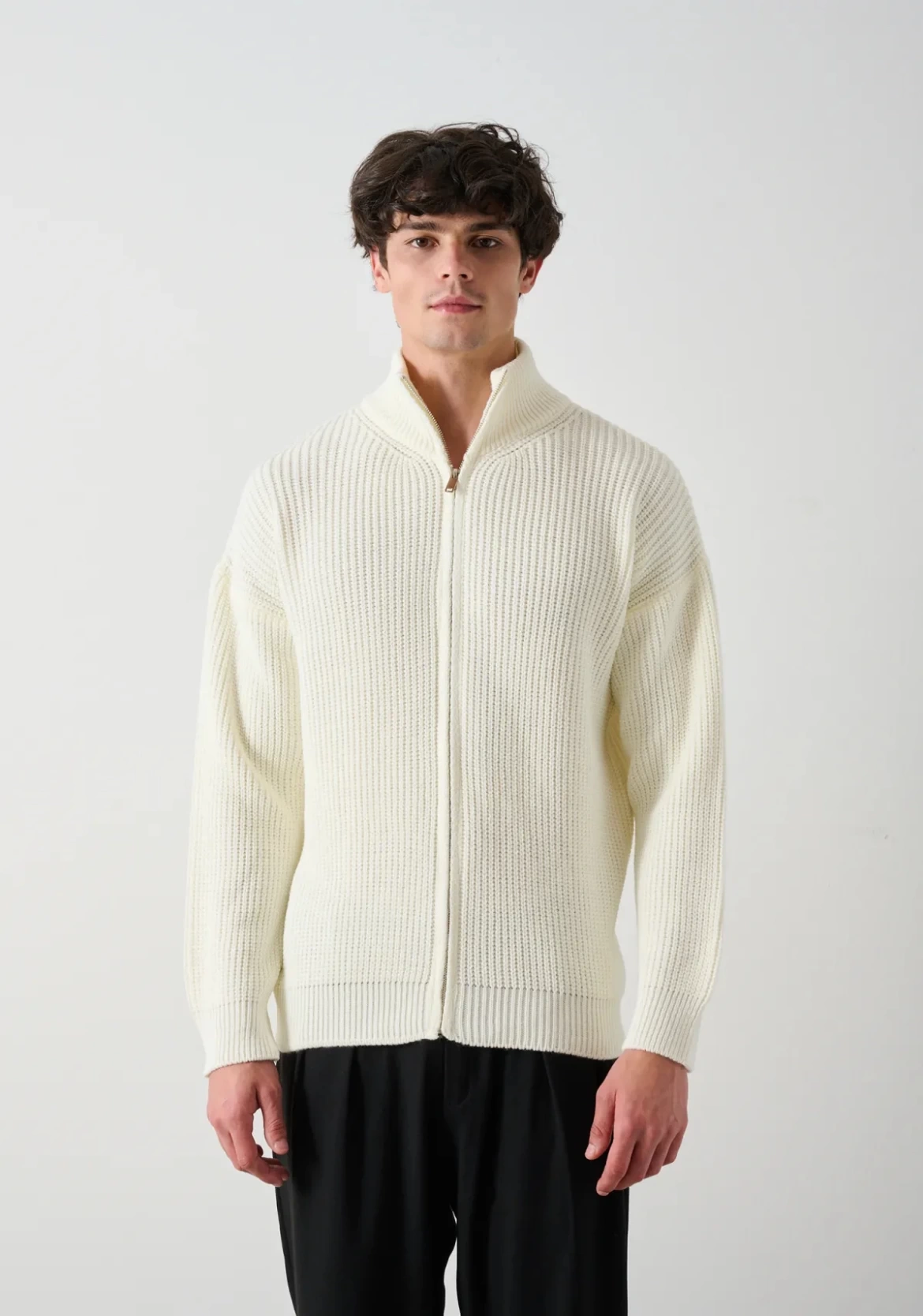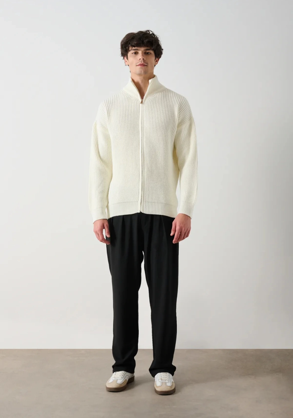 Erkek Owersize Hakim Yaka Fermuarlı Hırka -Beyaz