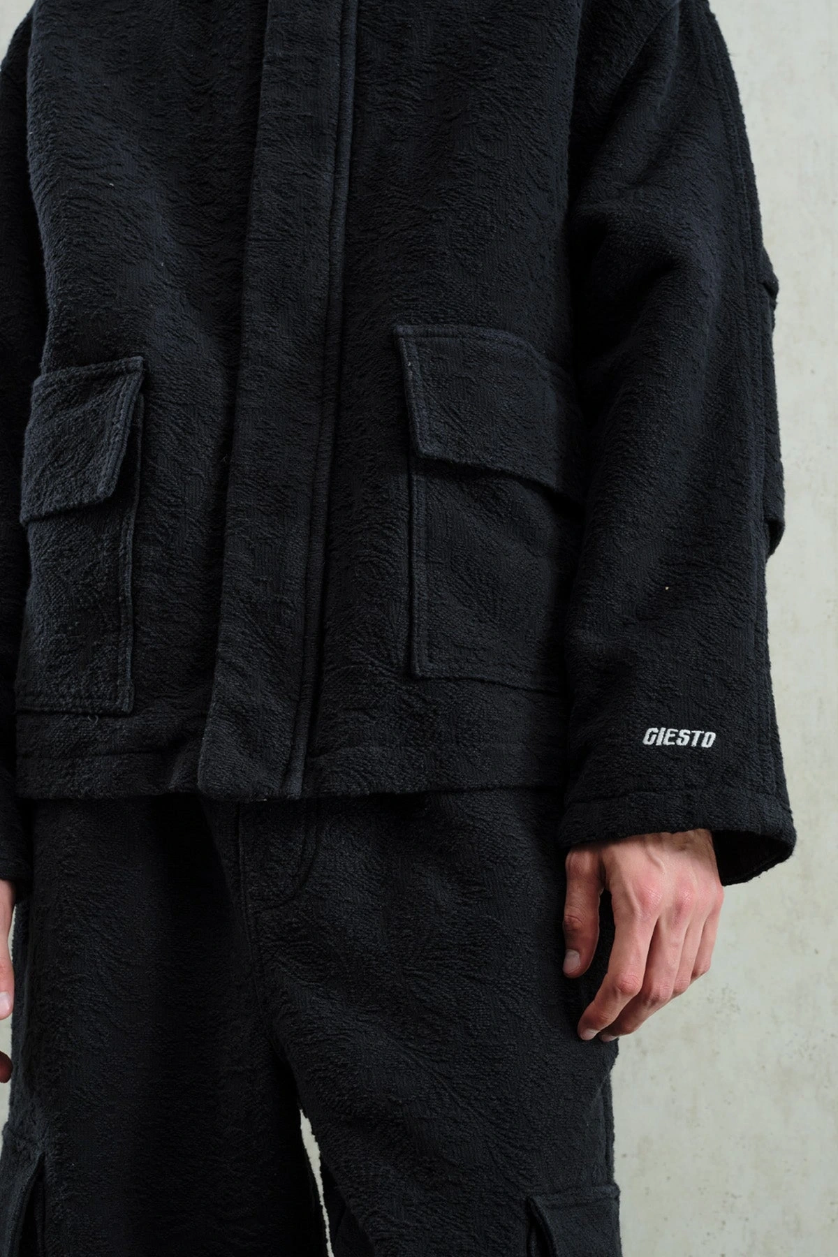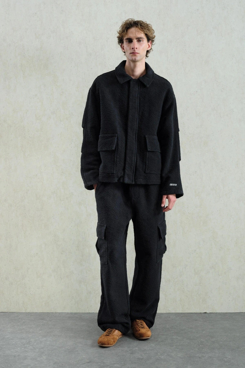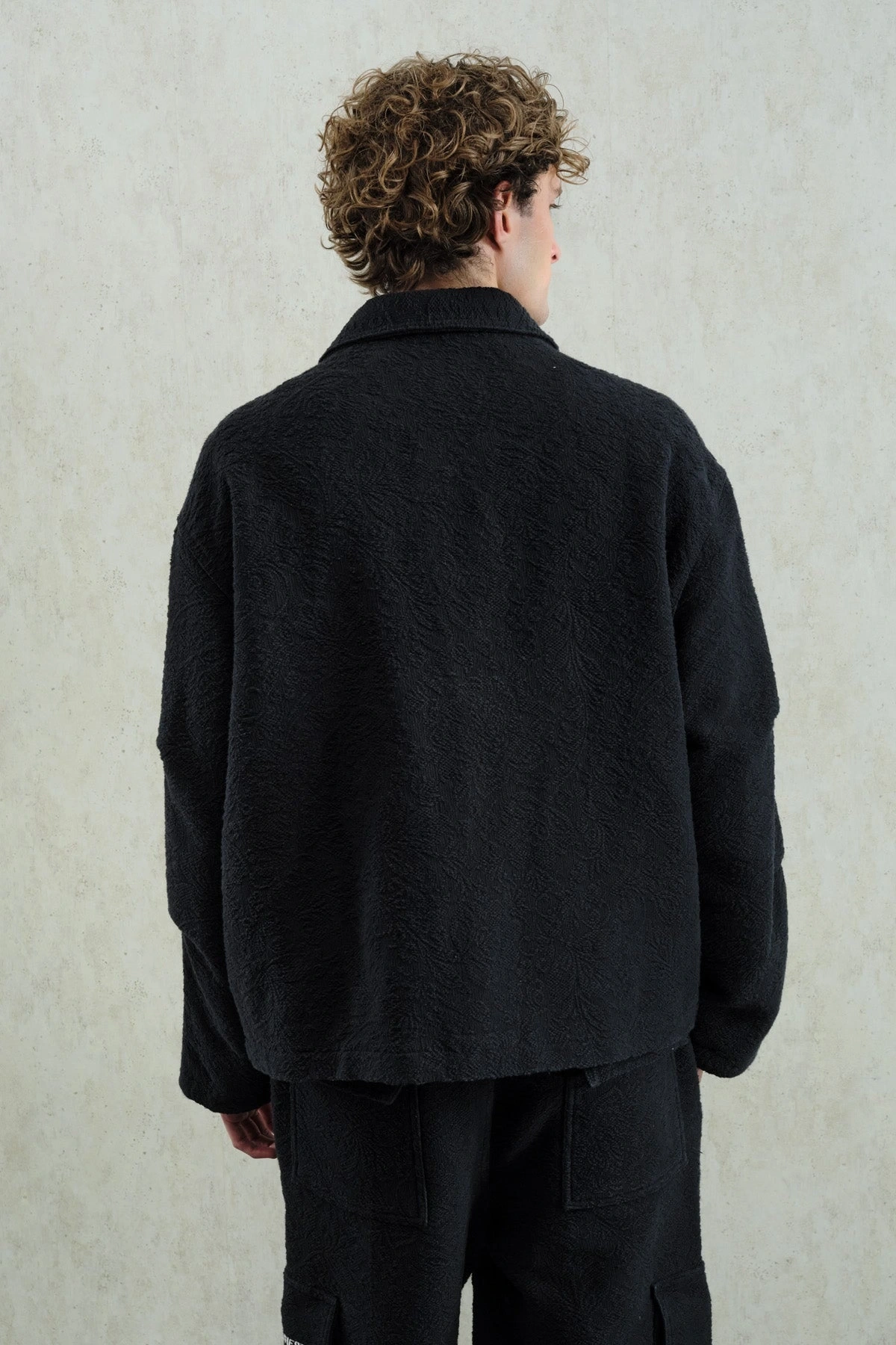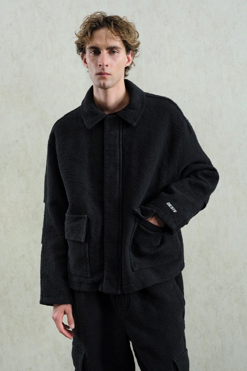 Erkek Owersize Kaşe Bomber Kendinden Desenli Mont -Siyah