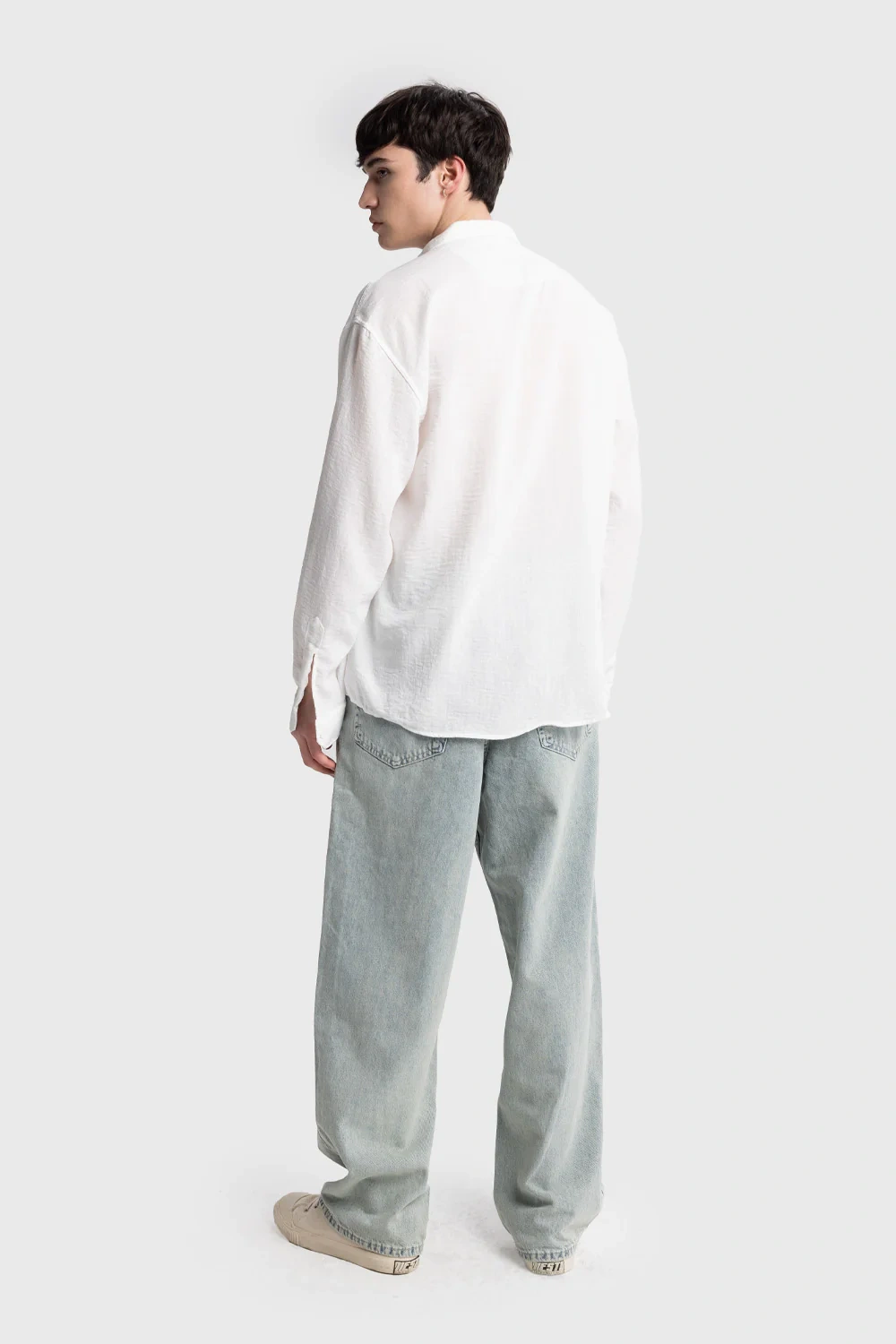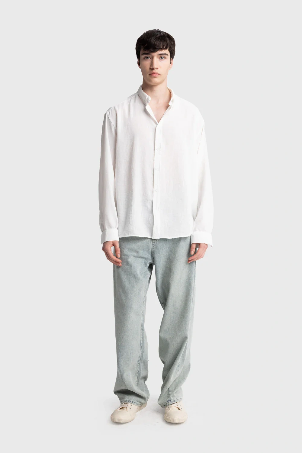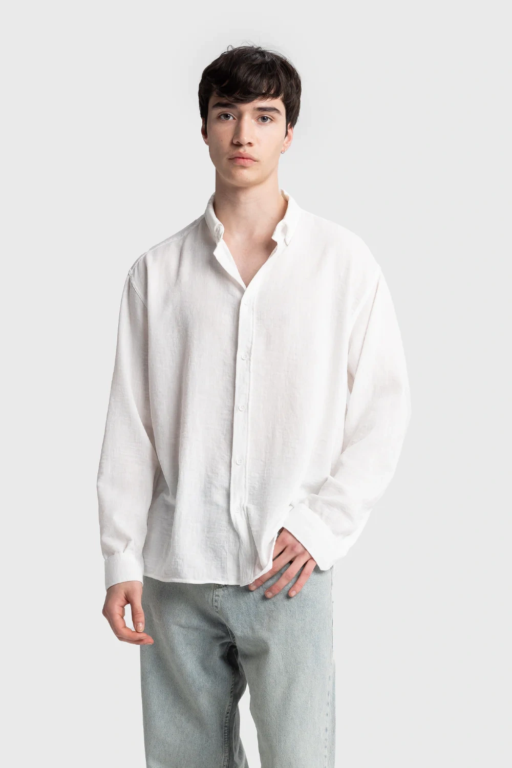 Oversize, Kırışık görünümlü, Yaka düğme detaylı, Dökümlü oversize erkek gömlek