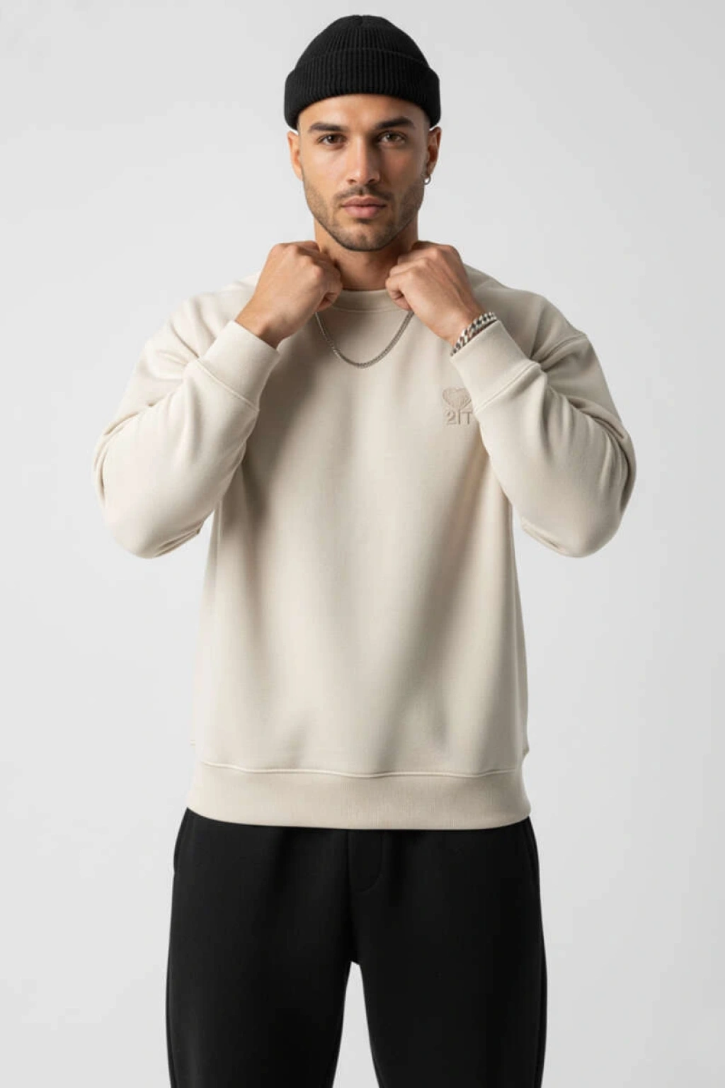Erkek Owersize Önü Baskılı Düz Basic Sweatshirt- Krem