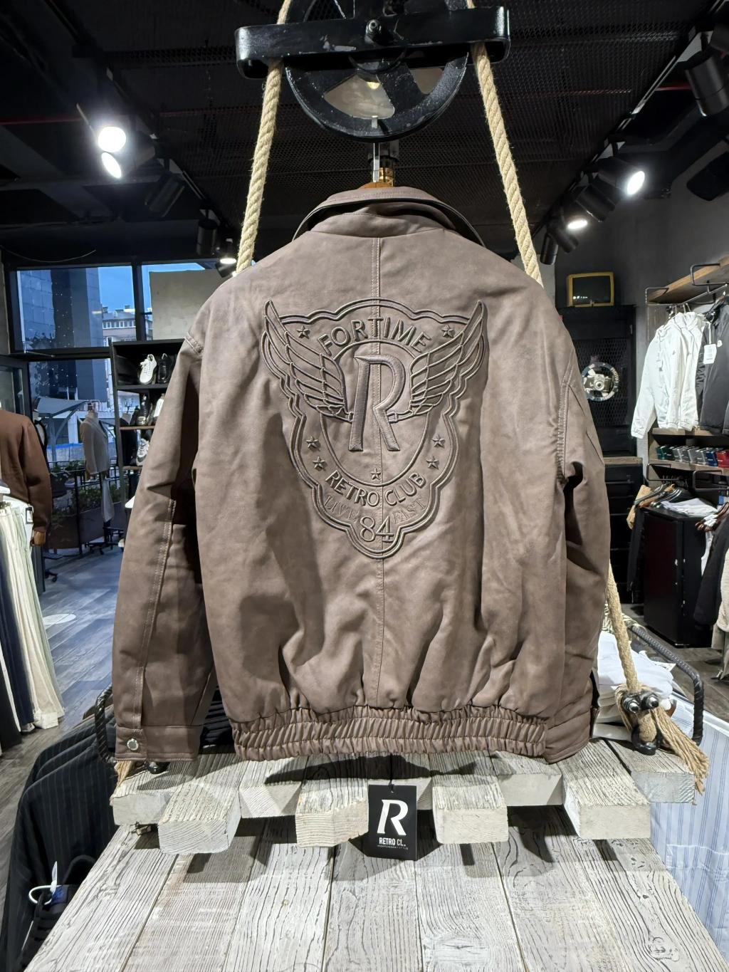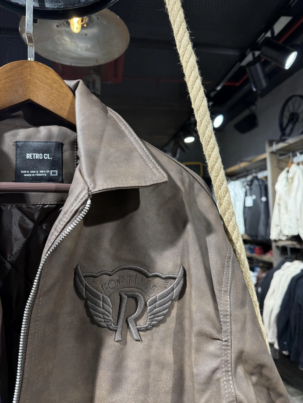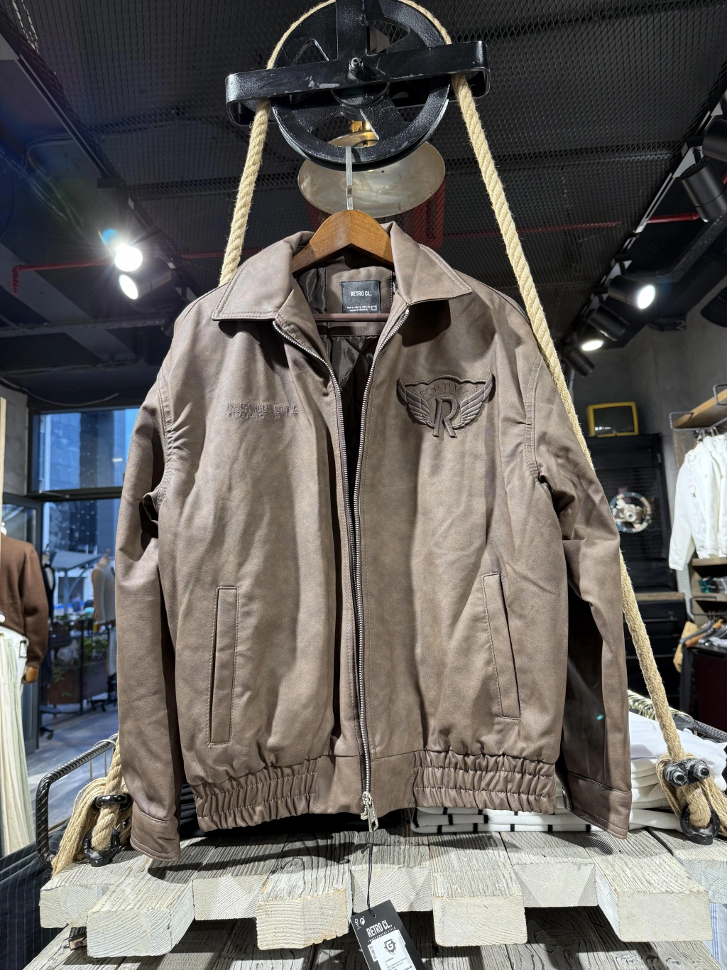 Erkek Owersıze Önü Fermuarlı Arka Baskılı Deri Mont - Kahverengi