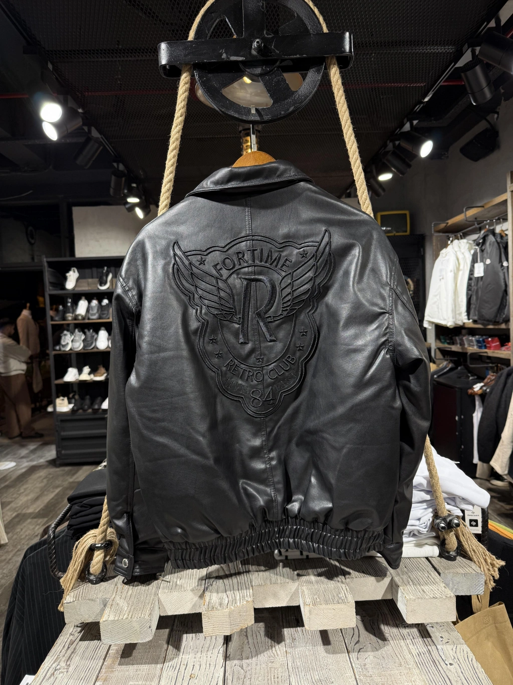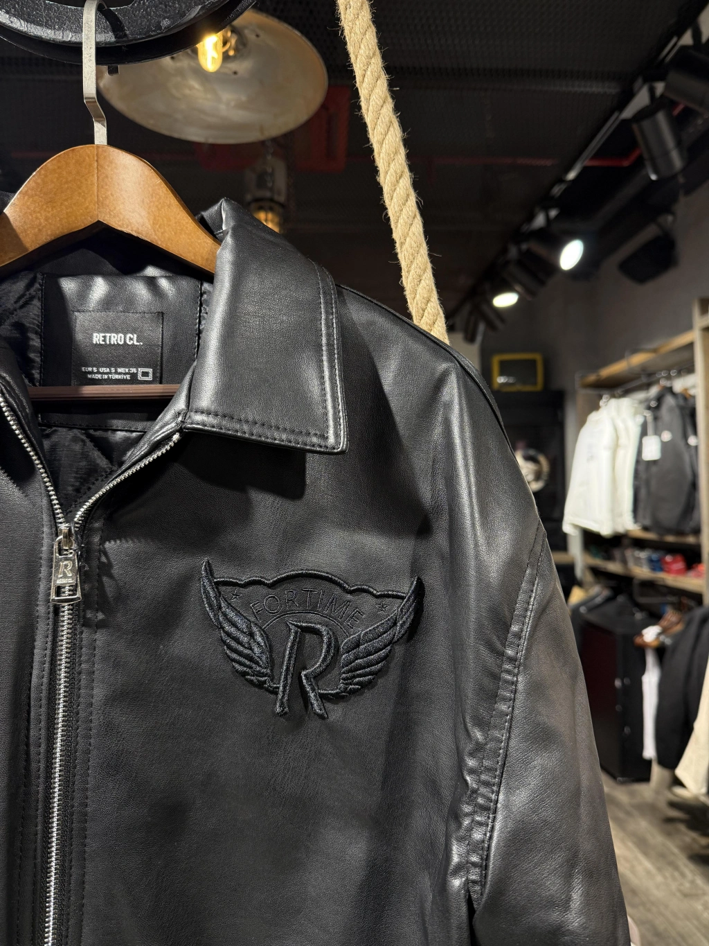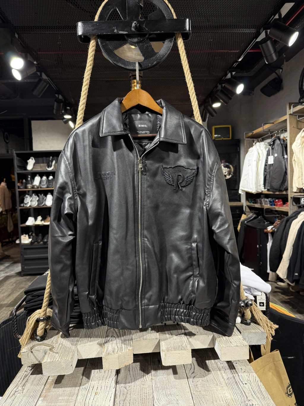 Erkek Owersıze Önü Fermuarlı Arka Baskılı Deri Mont - Siyah