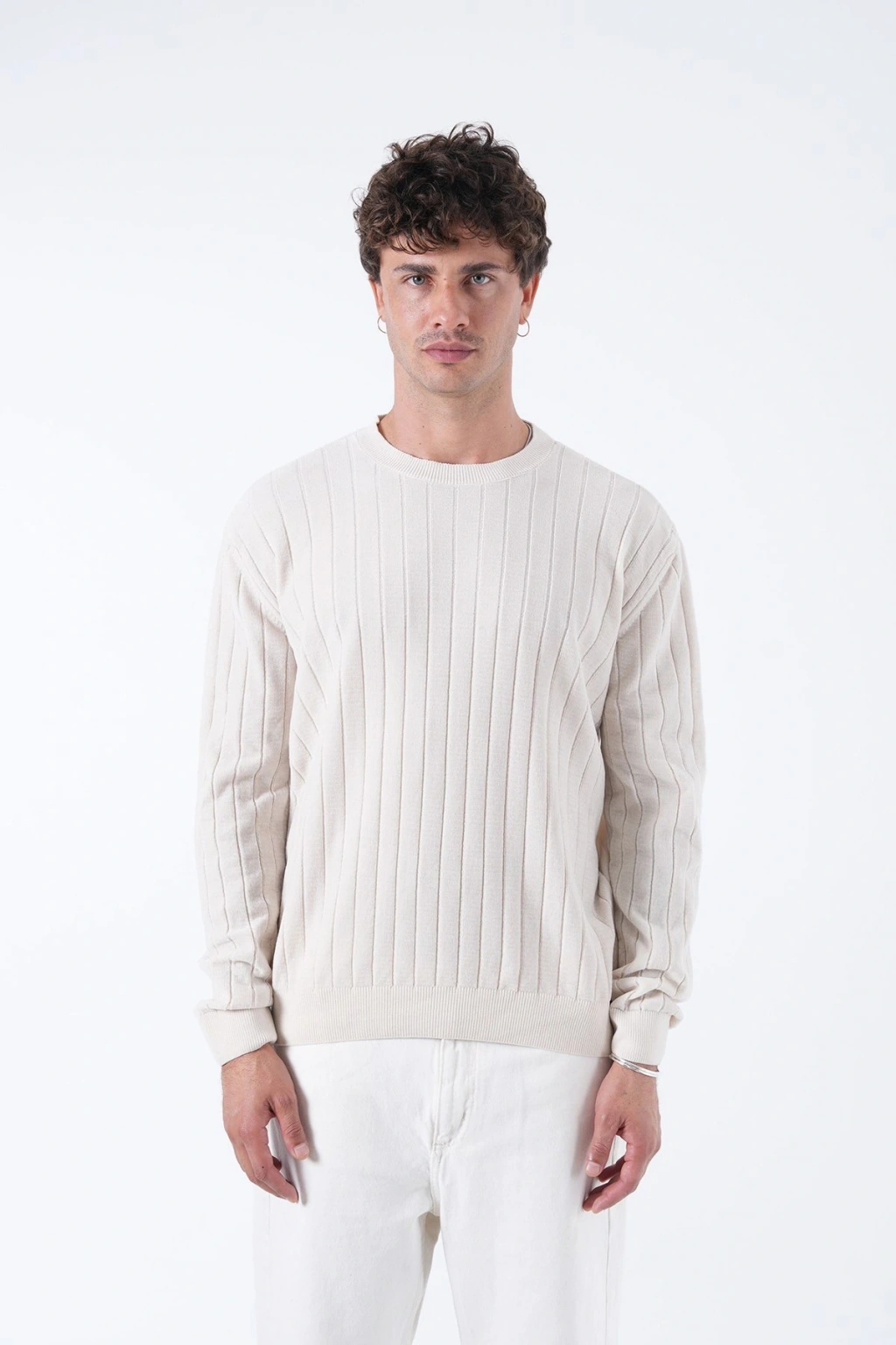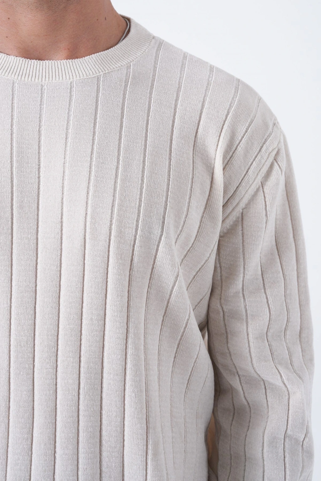 Erkek Owersize Önü Kendinden Çizgili Uzun Kol Triko - Beyaz
