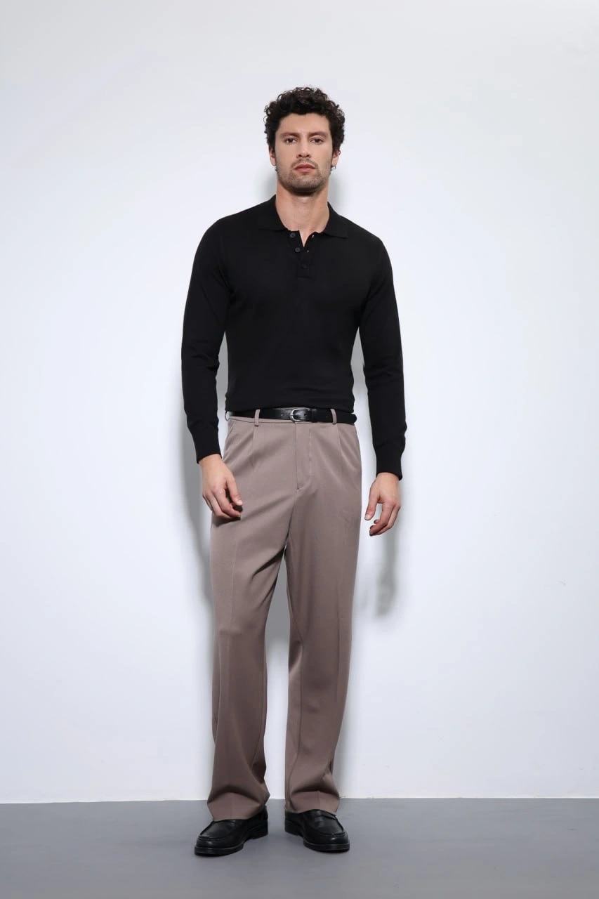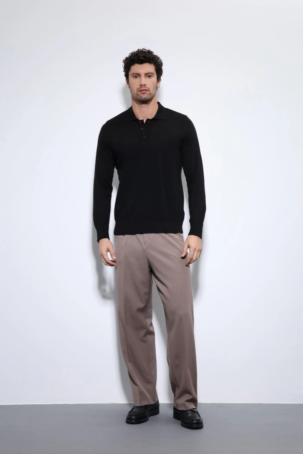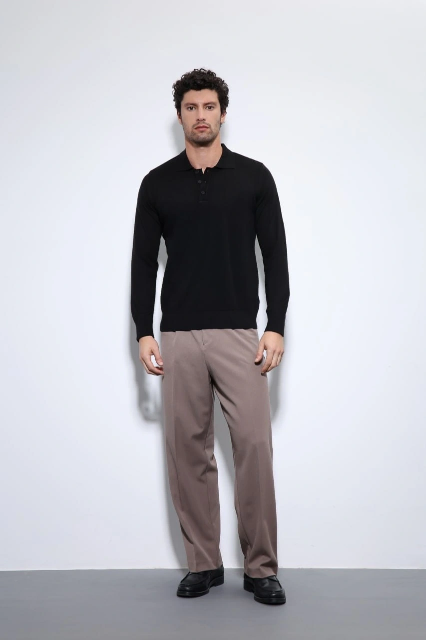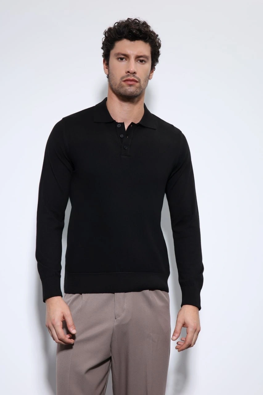 Erkek Polo Yaka Uzunkol Pamuklu Triko -Siyah