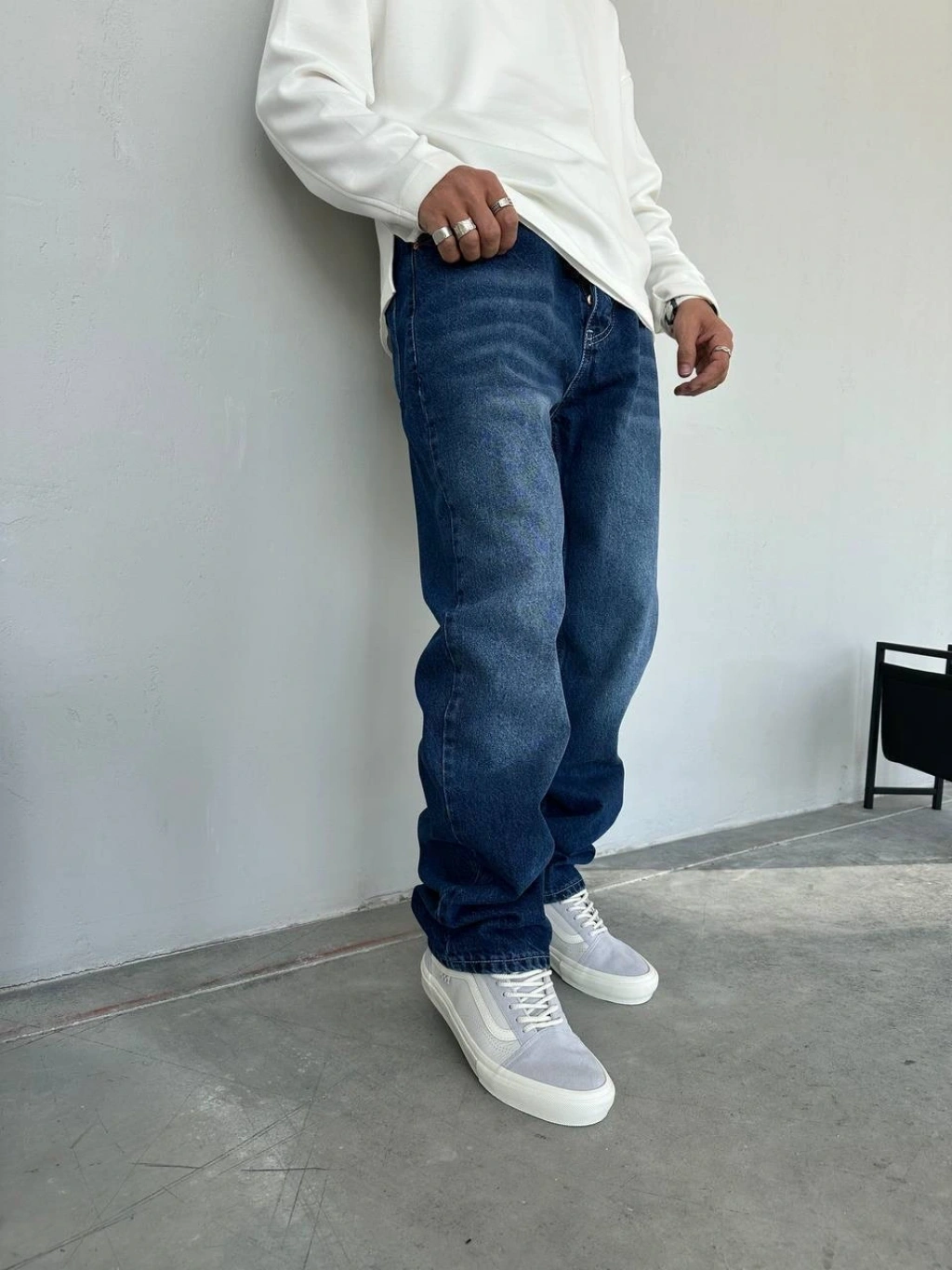 Erkek Rahat Kalıp Taşlamalı Baggy Kot Pantolon - Lacivert
