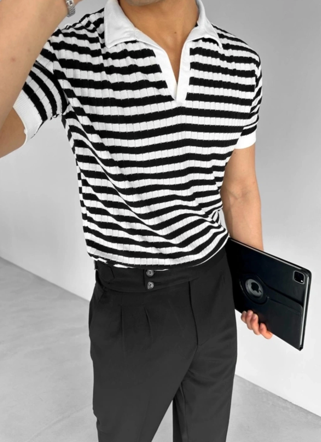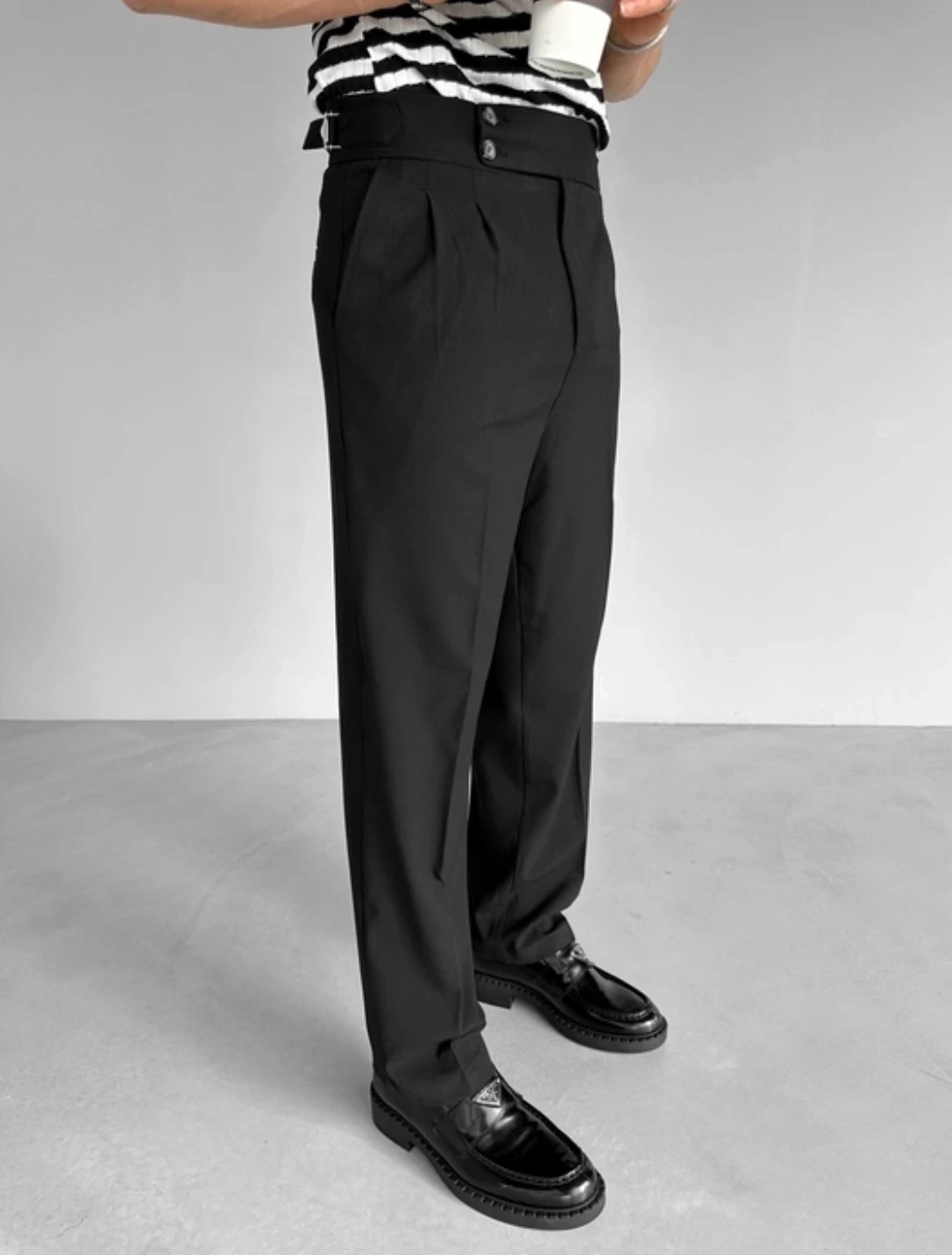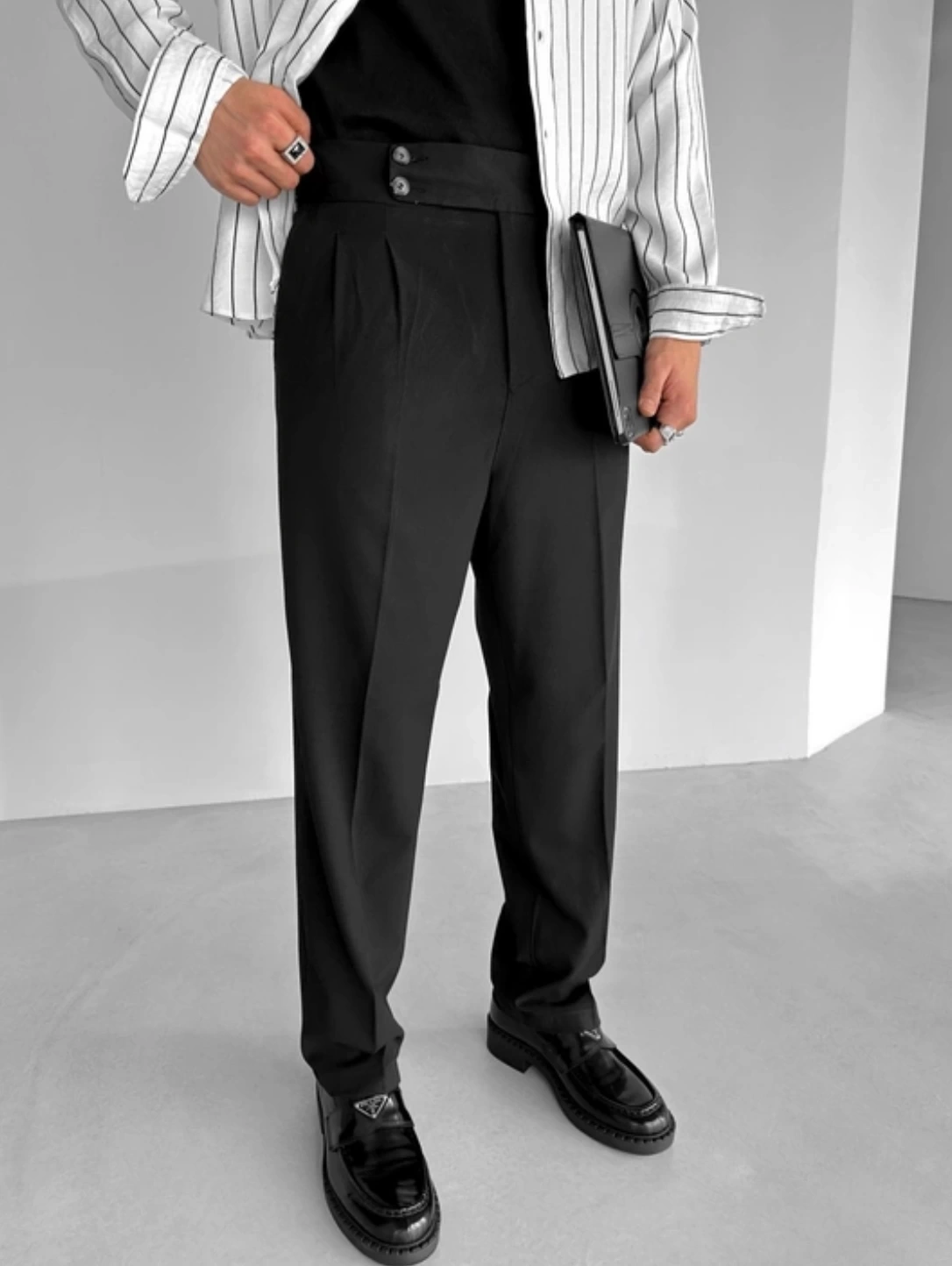 Erkek Yüksek Bel Rahat Kesim Pileli Pantolon-Siyah