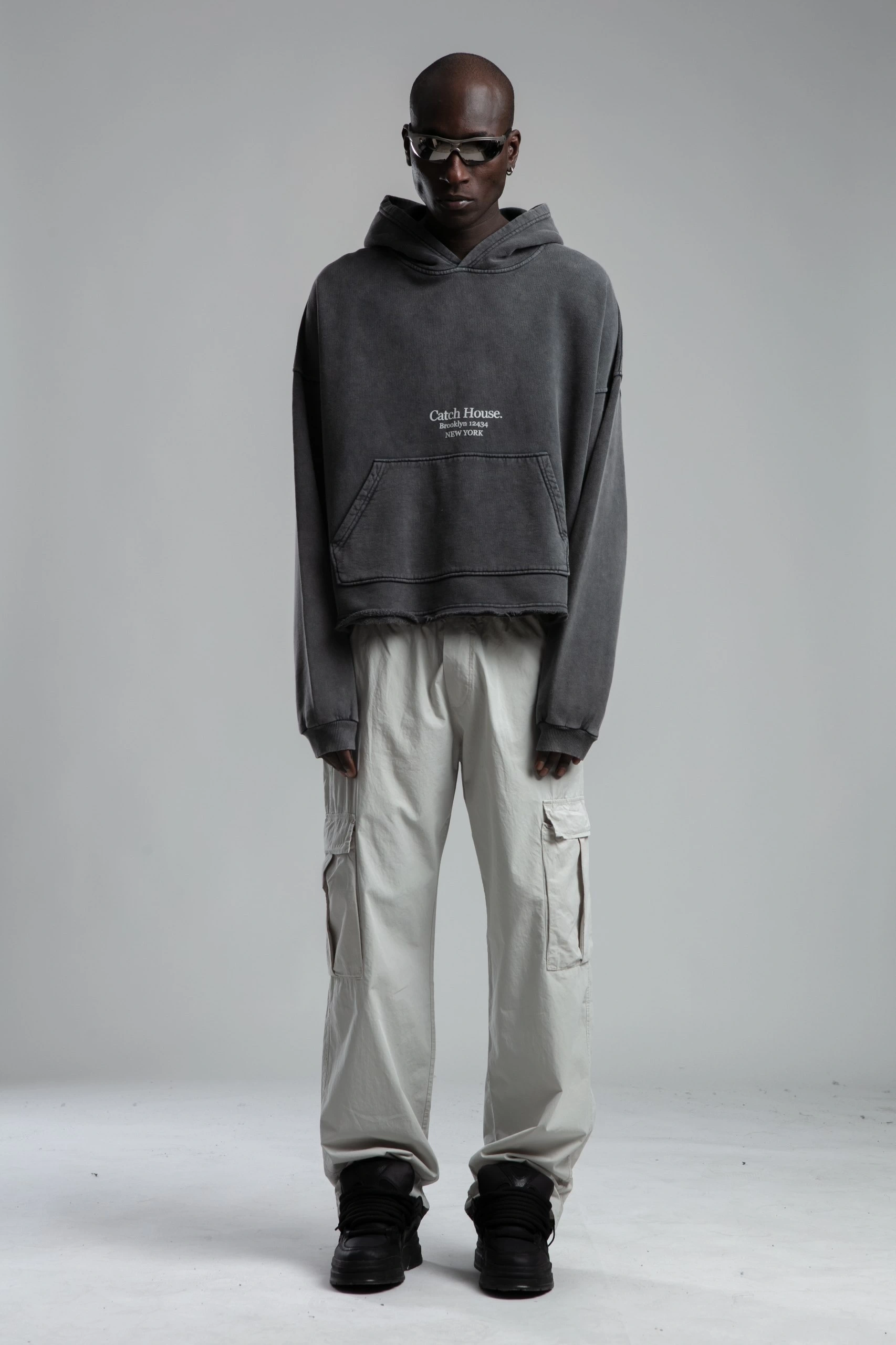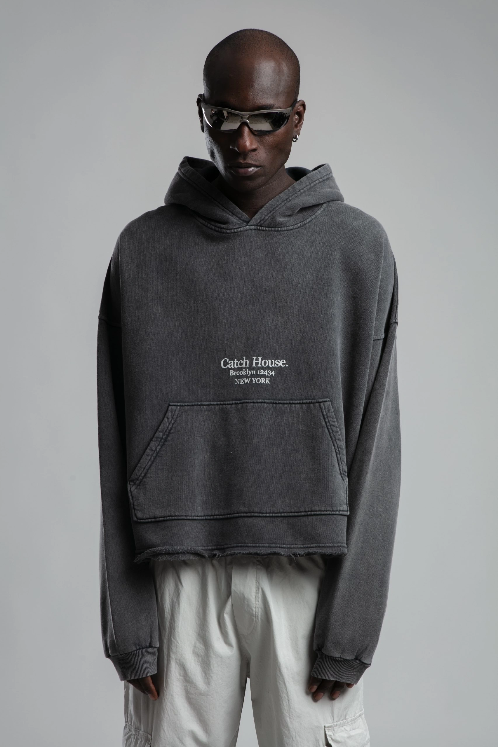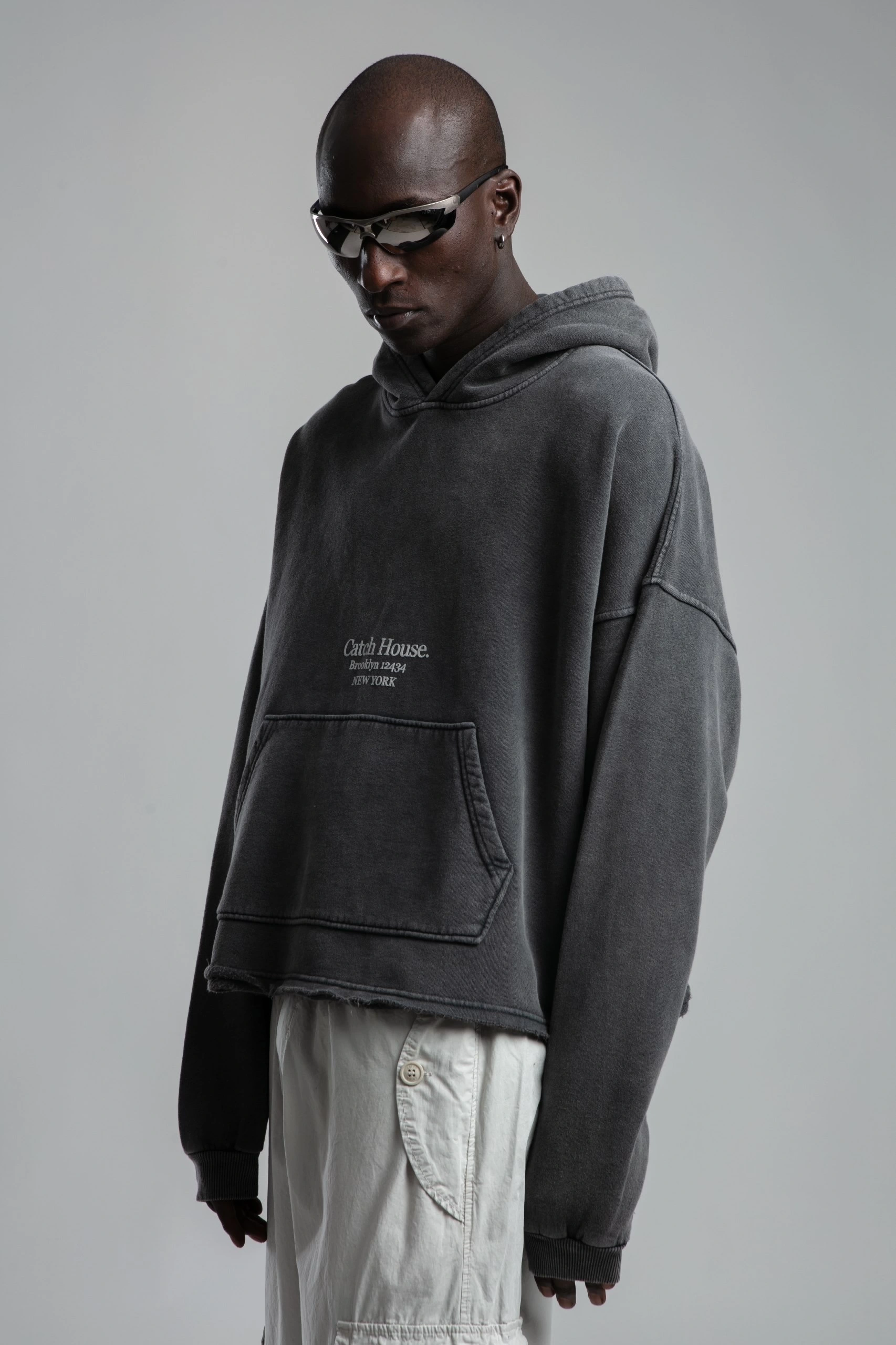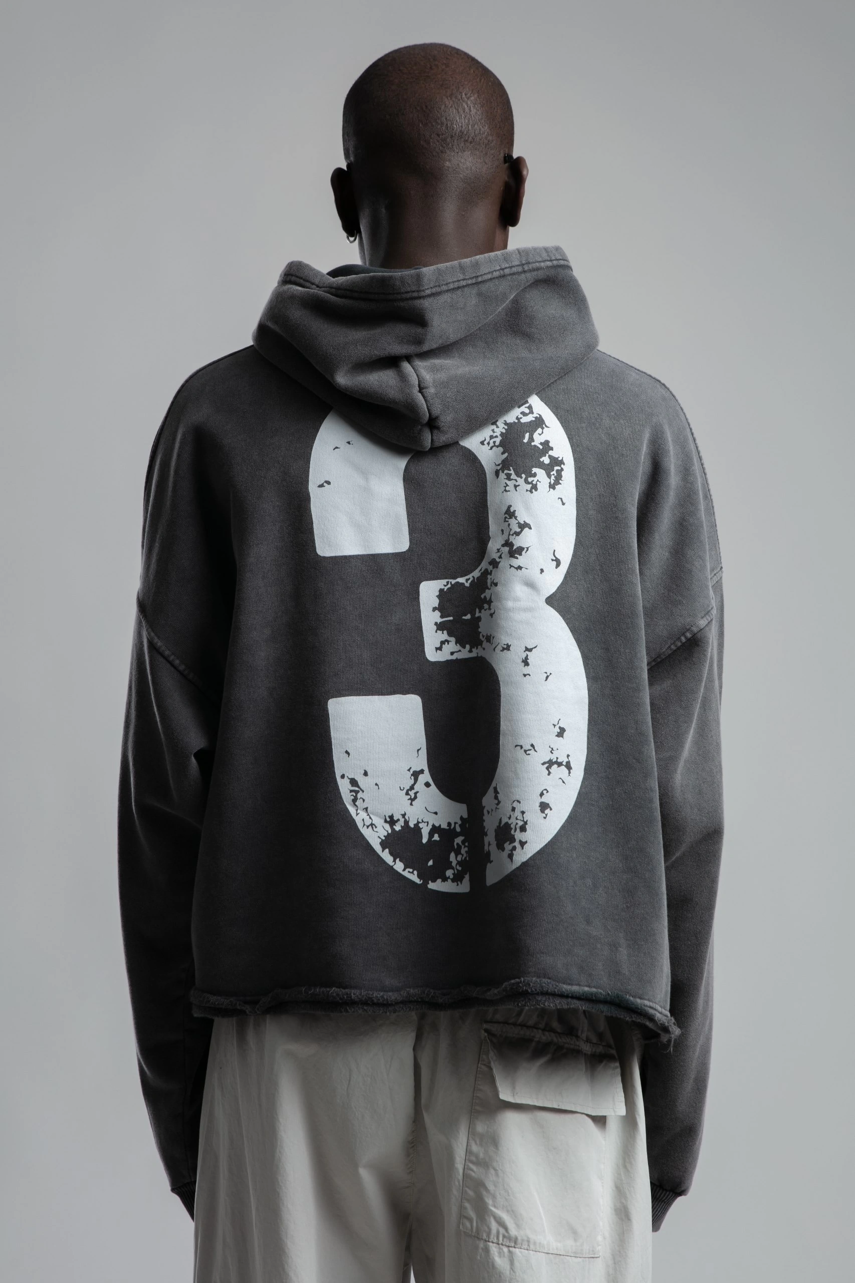 Owersize Arkası 03 Baskılı Kapüşonlu Yıkamalı Sweatshirt -Füme