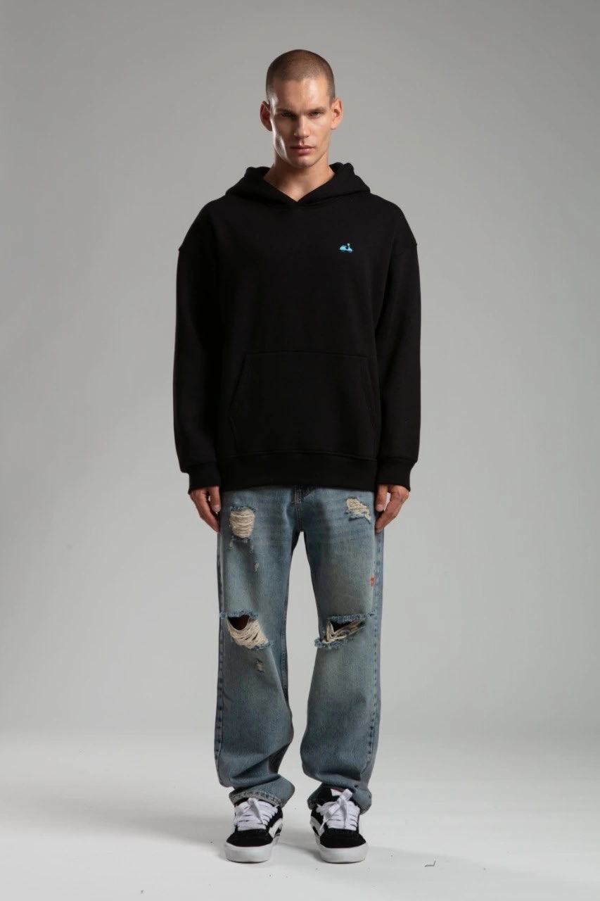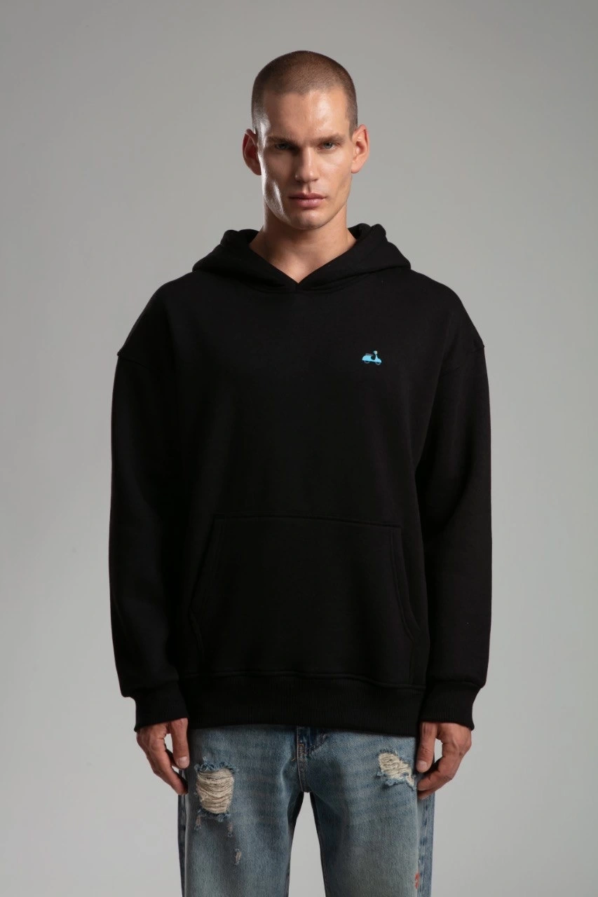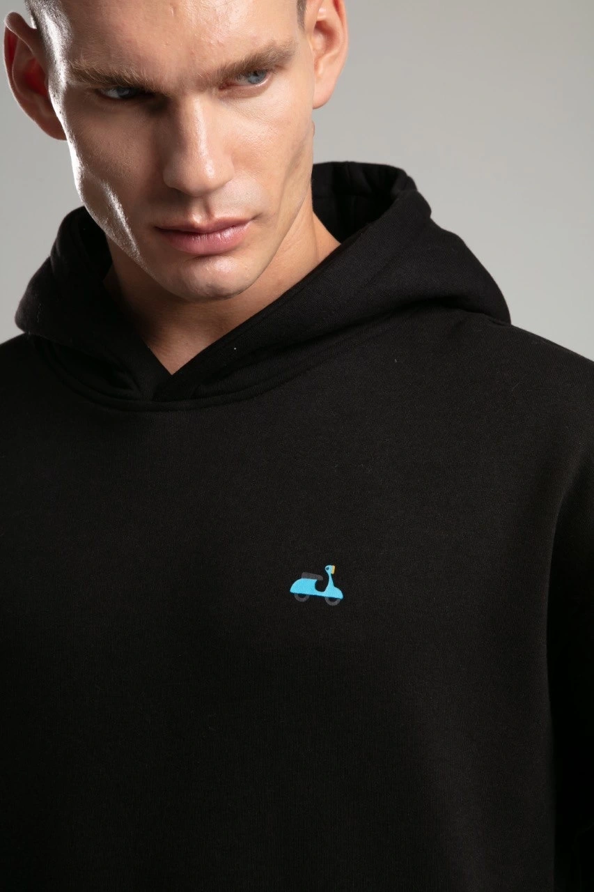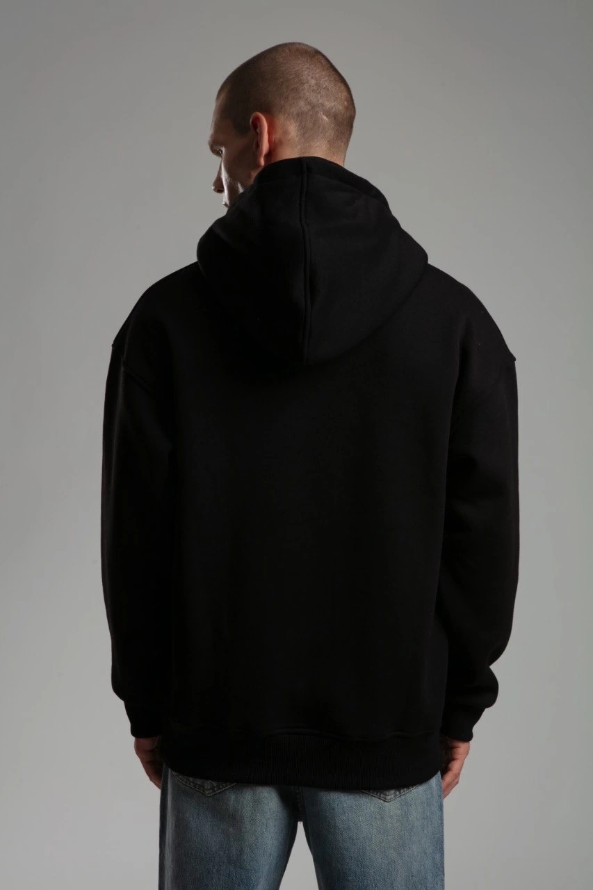 Owersize İçi Şardonlu Kapüşonlu Baskılı Sweatshirt -Siyah